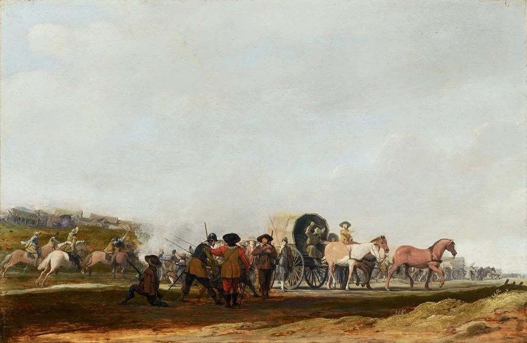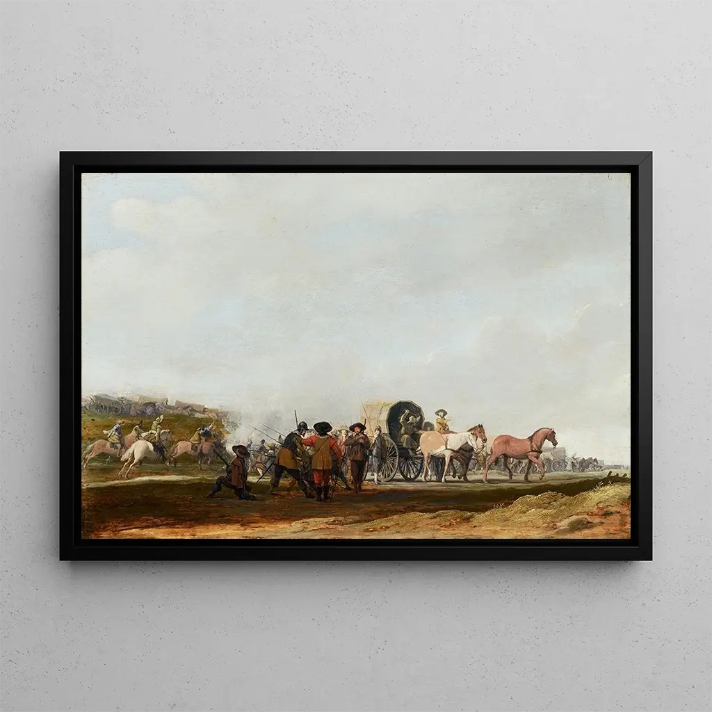 L'œuvre "Embuscade d'un convoi militaire" af Pieter Post skildrer en krigsscene, hvor spændingen er tydelig. De mørke og jordnære farver dominerer, hvilket skaber en atmosfære af forestående fare. Den dynamiske komposition, med soldater i bevægelse og landskabselementer, der indrammer handlingen, fanger øjet og bringer betragteren ind i selve konfrontationen. Posts teknik, der blander realisme og detaljerigdom, gør det muligt at føle adrenalinen i øjeblikket, mens skygger og lys spiller en afgørende rolle i scenografien for denne kunsttryk.