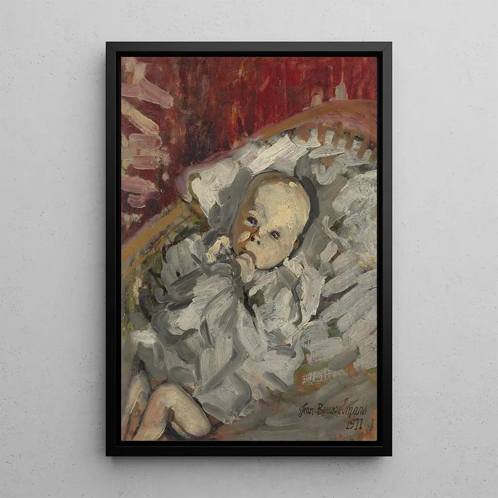 "Enfant dans le berceau" af Jean Brusselmans er et kunsttryk, der fremkalder blidhed og ro i barndommen. På dette lærred skildrer den belgiske maler en fredeligt sovende spædbarn, indhyllet i fine lagner. Pastelfarver og bløde nuancer skaber en beroligende atmosfære, mens det bløde lys, der filtreres gennem scenen, understreger sårbarheden og skønheden i dette intime øjeblik. Brusselmans' teknik, kendetegnet ved enkle former og delikate konturer, forstærker den følelse, der udspringer af denne rørende kunsttryk.