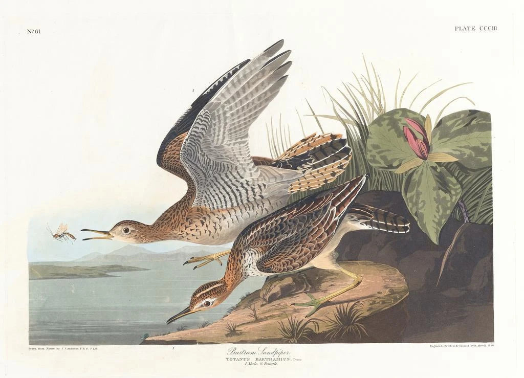 John James Audubon, naturforsker og maler fra begyndelsen af det 19. århundrede, er anerkendt som en af pionererne inden for ornitologi. Hans værker, herunder "Bécasseau de Bartram", er ikke kun kunstneriske gengivelser, men også værdifulde videnskabelige studier. Audubon rejste gennem USA for at observere og dokumentere fugle i deres naturlige habitat, påvirket af den romantiske bevægelse, der værdsatte naturen. Hans arbejde har haft en varig indflydelse på bevarelsen og værdsættelsen af fuglearter, hvilket gør ham til en ikonisk figur inden for kunst og videnskab.