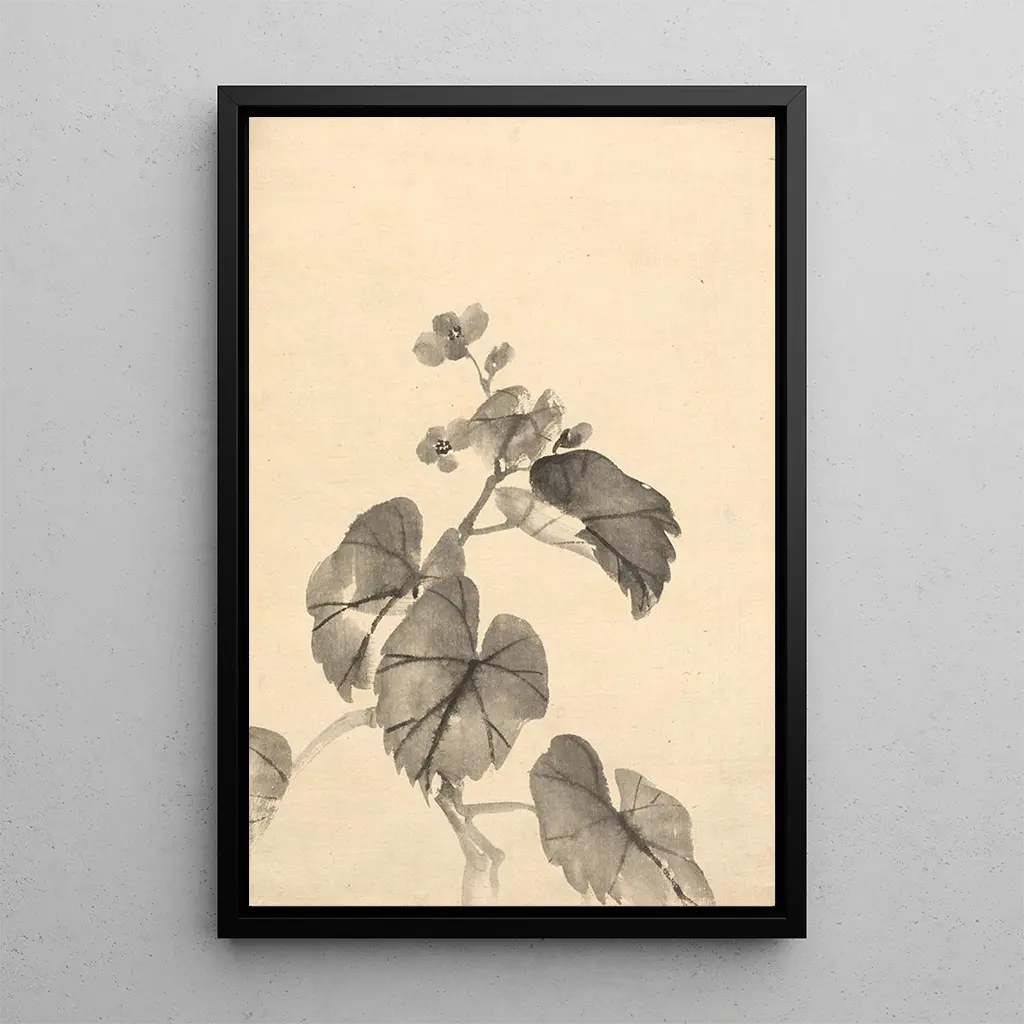 Den kunsttryk "Branche de bégonia en fleurs" af Kono Bairei er et delikat værk, der fremkalder naturens ynde og ro. Pastelfarverne, fra blid rosa til blid grøn, blander sig harmonisk for at skabe en beroligende atmosfære. Teknikken med blæk på papir, typisk for den japanske skole, gør det muligt at fange de fine detaljer i kronblade og blade, hvilket bringer denne blomsterkomposition til live. Hvert penselstrøg synes at danse på lærredet og inviterer betragteren til en stille og meditativ eftertanke.
