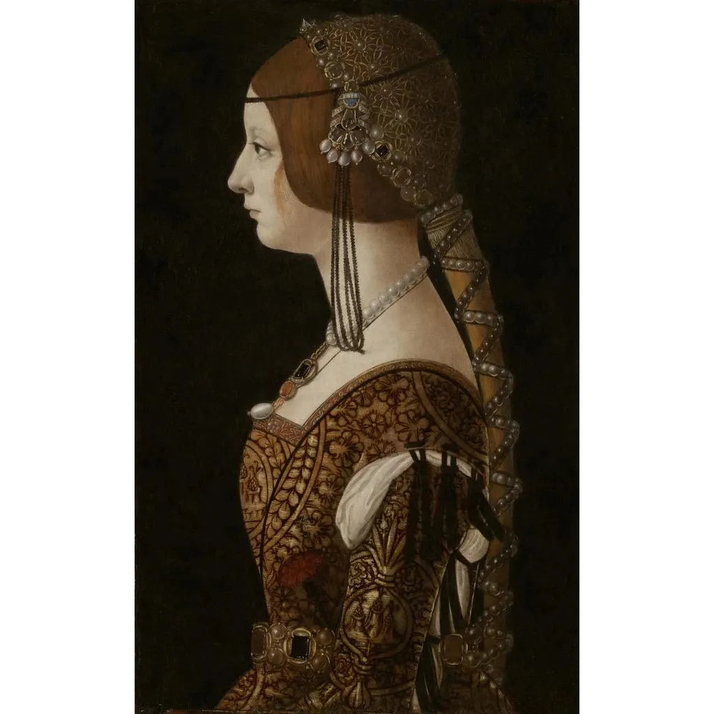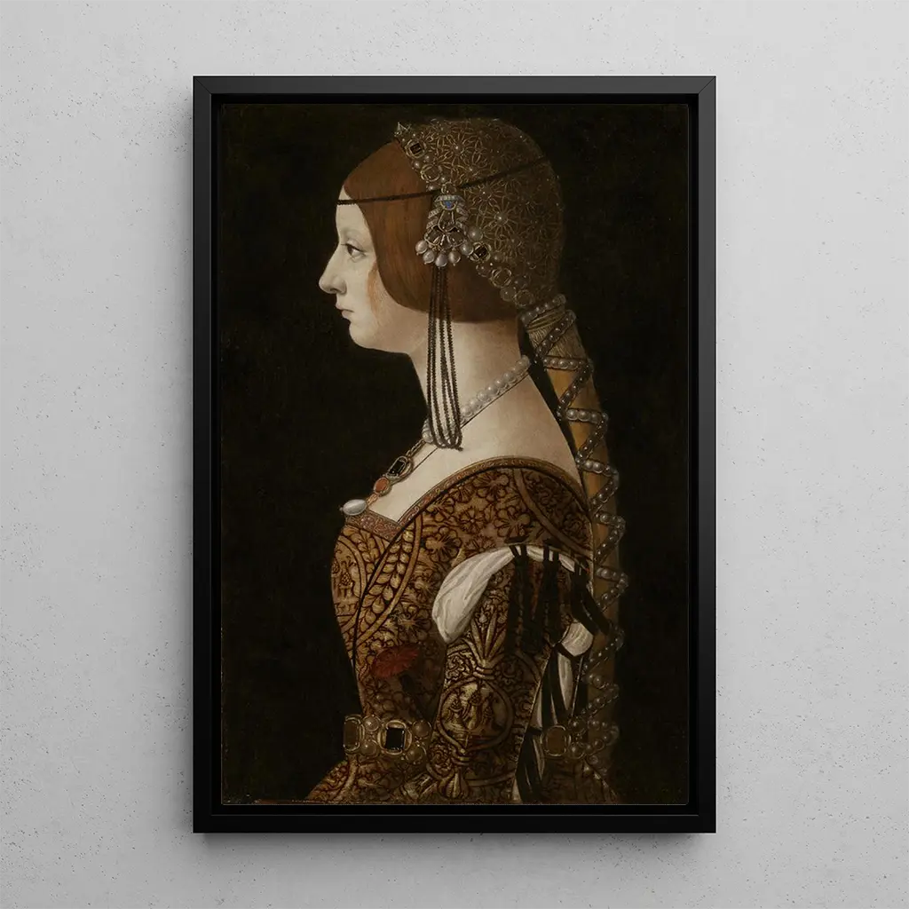 Kunsttrykket af Bianca Maria Sforza er et ideelt dekorativt stykke til at berige dit hjem, uanset om det er i en stue, et kontor eller et soveværelse. Dets trykkvalitet sikrer en bemærkelsesværdig trofasthed over for detaljerne i originalen, hvilket gør det muligt at nyde skønheden af dette værk fuldt ud. Med sin ubestridelige æstetiske appel tilføjer dette maleri et strejf af elegance og sofistikation til ethvert rum. Ved at vælge dette lærred, vælger du en dekoration, der ikke blot forskønner, men også fortæller en fascinerende historie – om en tid, hvor kunst og skønhed var i centrum af dagligdagen.