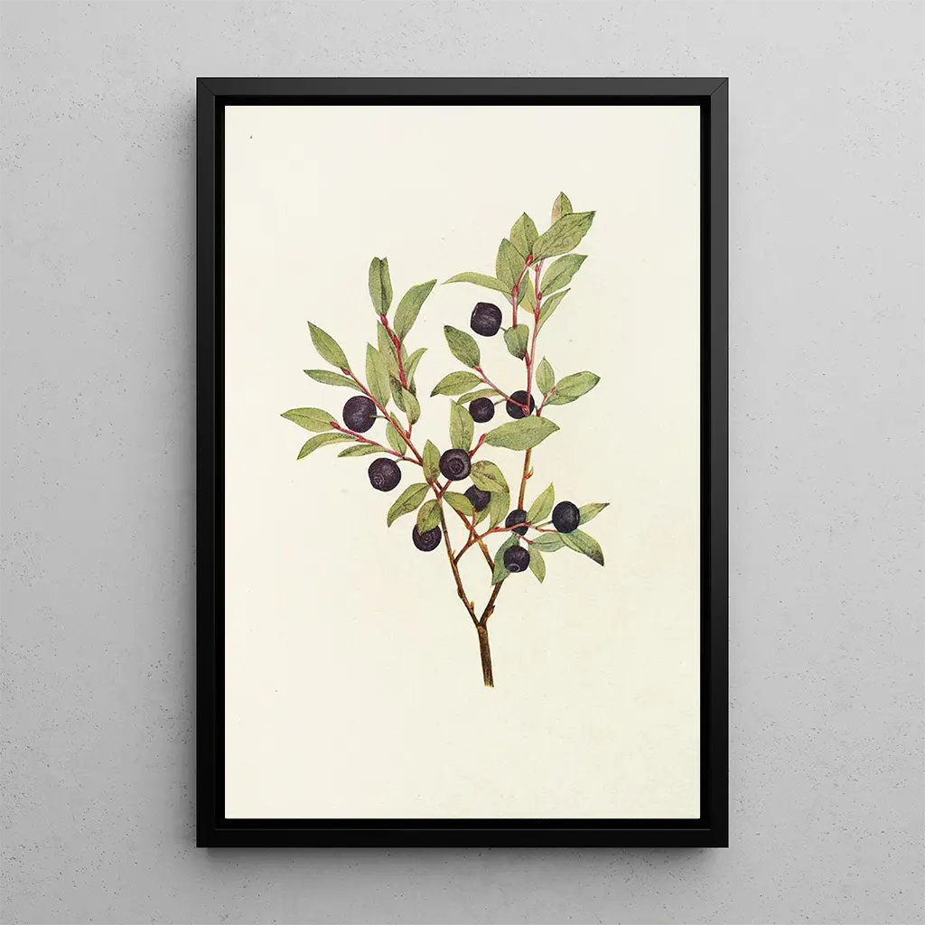 Den kunsttryk af værket "Myrtille à grandes feuilles" af Mary Vaux Walcott tager os med ind i en rig og delikat botanisk verden. Med livlige farver, der spænder fra dyb grøn til strålende blå, fremkalder dette lærred skønheden i de nordamerikanske skove. Akvarelteknikken, mestret af kunstneren, gør det muligt at fange gennemsigtigheden af bladene og blidheden af frugterne, hvilket skaber en fredelig og kontemplativ atmosfære. Hvert detalje, fra nervetråde i bladene til skygger, vidner om en grundig observation af naturen og inviterer betragteren til at værdsætte både enkelheden og kompleksiteten i floraen.