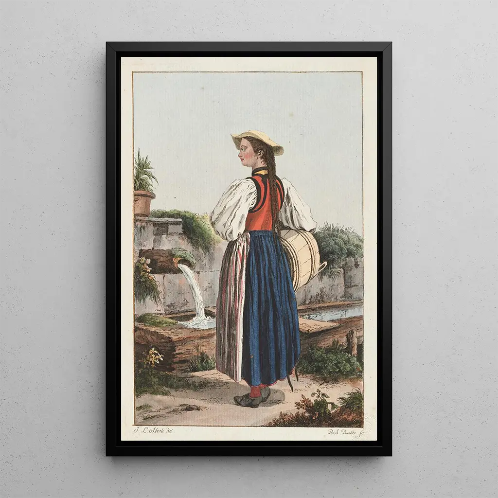 Kunsttrykket af lærredet "Paysanne des environs de Berne" af Johann Ludwig Aberli fremkalder en idyllisk scene fyldt med ro. De bløde og naturlige farver, domineret af beroligende grønne nuancer og jordfarver, fordyber betragteren i et typisk schweizisk landskab. Akvarelteknikken, anvendt med finesse, gør det muligt at fange lyset og atmosfæren fra denne æra. Den værdige landarbejderske, afbildet med værdighed, synes at beskæftige sig med sine daglige pligter, hvilket symboliserer enkelheden og skønheden i det landlige liv. Dette kunsttryk inviterer til en fredelig refleksion og afslører dybden af det schweiziske landliv i det attende århundrede.