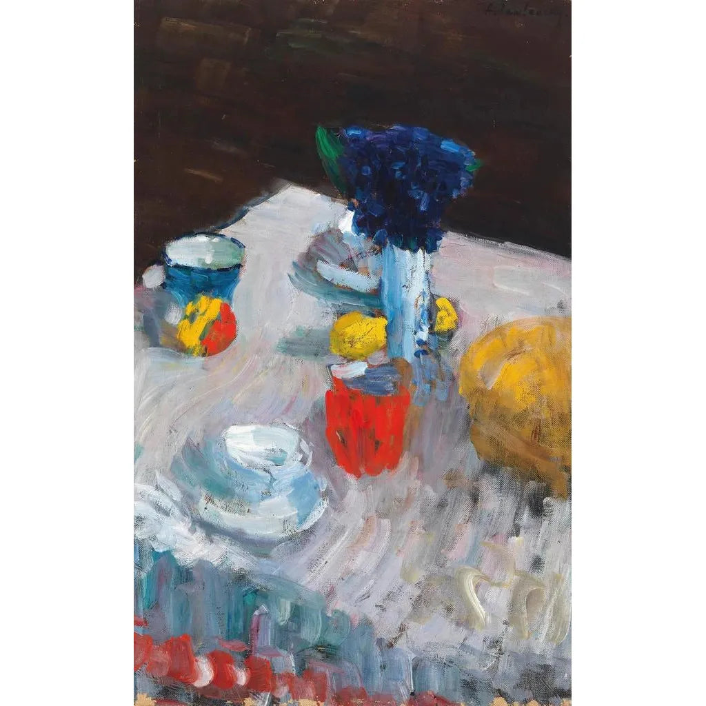"Table dækning" af Alexej von Jawlensky er et fængslende kunsttryk, der fremkalder en scene fra dagligdagen med en unik kunstnerisk nuance. Kompositionen viser et bord pyntet med omhyggeligt arrangerede genstande, hvor de livlige farver og stiliserede former blander sig for at skabe en varm og indbydende atmosfære. Nuancerne af blå, rød og gul supplerer hinanden og skaber en visuel dynamik, der fanger øjet. Jawlenskys teknik, der kombinerer abstraktion og figurativitet, giver denne scene dybde og rigdom, som inviterer til eftertanke.