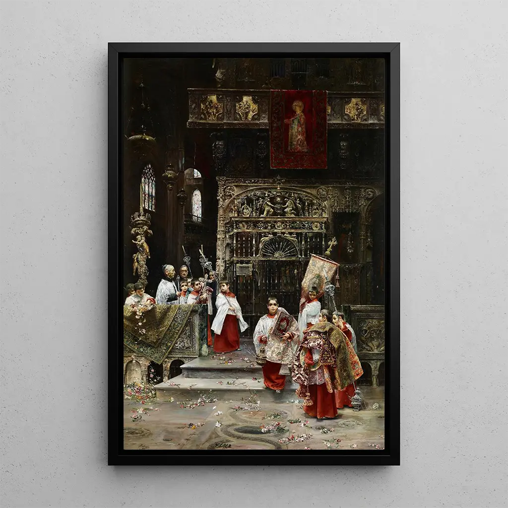 "Enfants de chœur" af José Gallegos y Arnosa er et kunsttryk, der skildrer renheden og uskylden i ungdommen gennem blikket af unge drenge i liturgiske klæder. De bløde og lyse farver, kombineret med en afbalanceret komposition, formidler en atmosfære af ro og fromhed. Gallegos y Arnosa anvender maleteknikker, der fremhæver de delikate udtryk hos børnene, hvilket skaber et billede fyldt med ømhed og spiritualitet. Hvert detalje, fra ansigter til folder, er omhyggeligt arbejdet for at fremkalde en følelse af fred og eftertanke.
