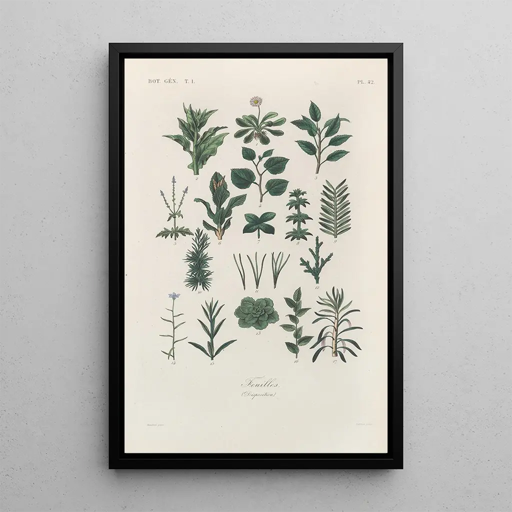 Traité de botanique générale Pl043 af François Hérincq er et sandt vindue åbent mod den planteverden. Hver plante er gengivet med bemærkelsesværdig præcision, hvilket fremhæver mangfoldigheden og skønheden i de naturlige former. De livlige nuancer, der spænder fra grønne toner til blomstrende farvestråler, skaber en levende og dynamisk atmosfære. Akvarelteknikken, anvendt med finesse, giver værket lethed og flydendehed, der fanger øjet. Dette kunstværk inviterer til en opmærksom betragning, der afslører floraens finurligheder og fejrer naturens rigdom.
