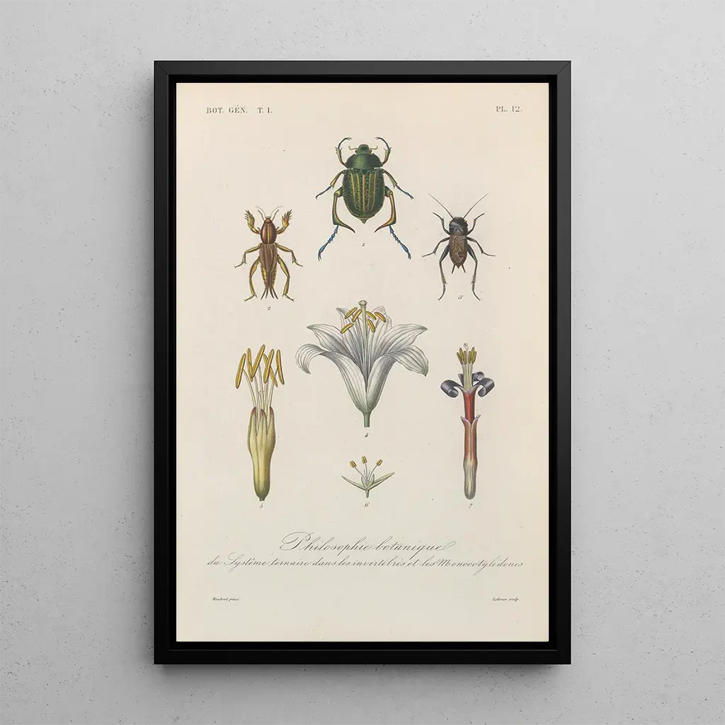 Kunsttrykket af maleriet Traité de botanisk generel kunsttryk Pl012 inviterer til en fordybelse i en verden af levende farver og minutiøse detaljer. François Hérincq, gennem sin teknik med gravering, fanger selve essensen af planter med bemærkelsesværdig præcision. De delikate nuancer af blade og blomster væves sammen og skaber en atmosfære, der både er beroligende og stimulerende. Hvert element i kompositionen synes at fortælle en historie og afslører den skjulte skønhed i naturen. Værket, både videnskabeligt og kunstnerisk, tilbyder en poetisk vision af botanik, hvor hver streg er en hyldest til den florale mangfoldighed.
