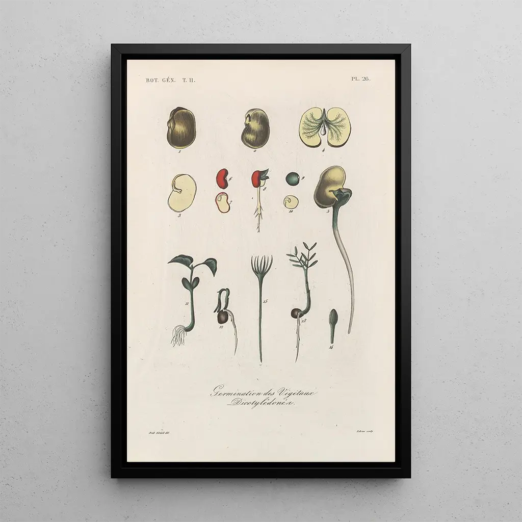 Kunsttrykket af maleriet Traité de botanique générale Pl077 tager os med ind i en verden, hvor naturen er fremhævet med en bemærkelsesværdig finesse. De livlige farver og de omhyggeligt detaljerede planter skaber en beroligende og kontemplativ atmosfære. Hvert element i kompositionen, fra delikate blade til blomstrende blomster, er omhyggeligt arrangeret for at invitere betragteren til at værdsætte skønheden i den vegetative verden. Den anvendte teknik, sandsynligvis akvarel eller gouache, giver en lethed og gennemsigtighed til hele værket, hvilket gør det næsten levende.
