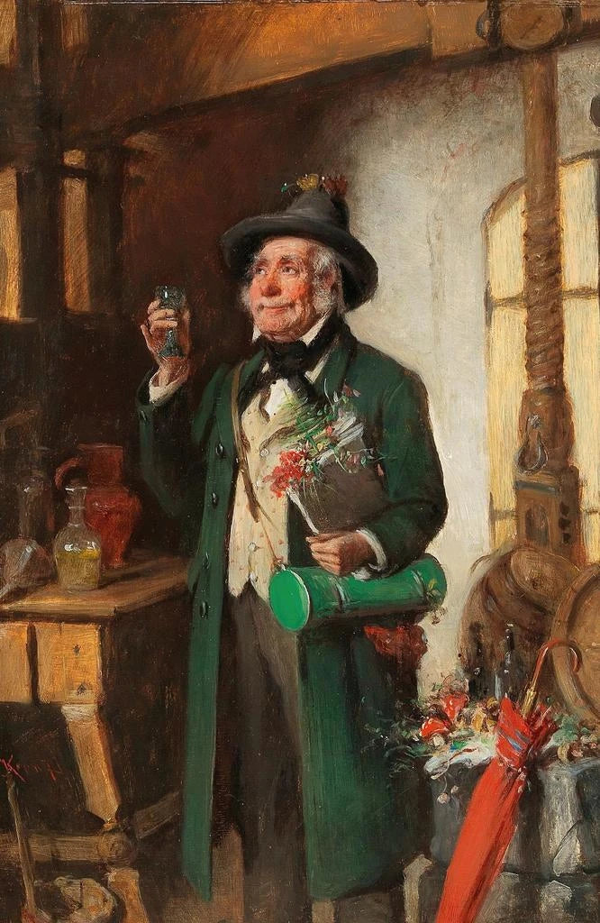 I "Le botaniste tilfreds" dykker Hermann Kern ned i en verden, hvor naturen og videnskaben mødes. Lærredet, rigt på detaljer, viser en botaniker dybt optaget af sine observationer, omgivet af frodige planter. De livlige farver og nuancer af grønt fremkalder friskheden af en blomstrende have, mens det bløde lys skaber en beroligende atmosfære. Kunstnerens teknik, der kombinerer realisme og impressionisme, giver mulighed for at føle botanikerens passion og forundring over floraens skønhed. Dette kunstværk inviterer til eftertanke og refleksion over vores forhold til naturen.