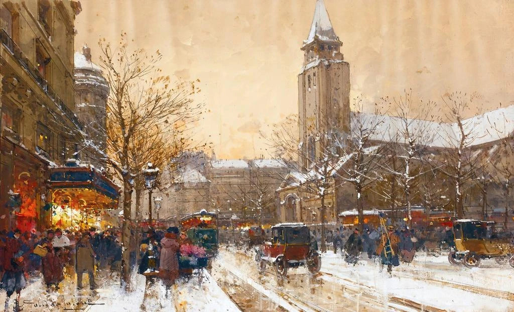 Eugène Galien-Laloue, aktiv i slutningen af det 19. århundrede og begyndelsen af det 20. århundrede, er kendt for sine skildringer af det parisiske liv. Påvirket af impressionisterne, har han formået at fange lyset og atmosfæren i Paris' gader med bemærkelsesværdig finesse. Hans værker, ofte præget af nostalgi, vidner om en tid, hvor byen var under stor forandring. Galien-Laloue har formået at indfange ikoniske steder, hvilket gør hans kunsttryk til vinduer til en svunden tid. Hans kunstneriske arv fortsætter med at inspirere kunstelskere og samlere.