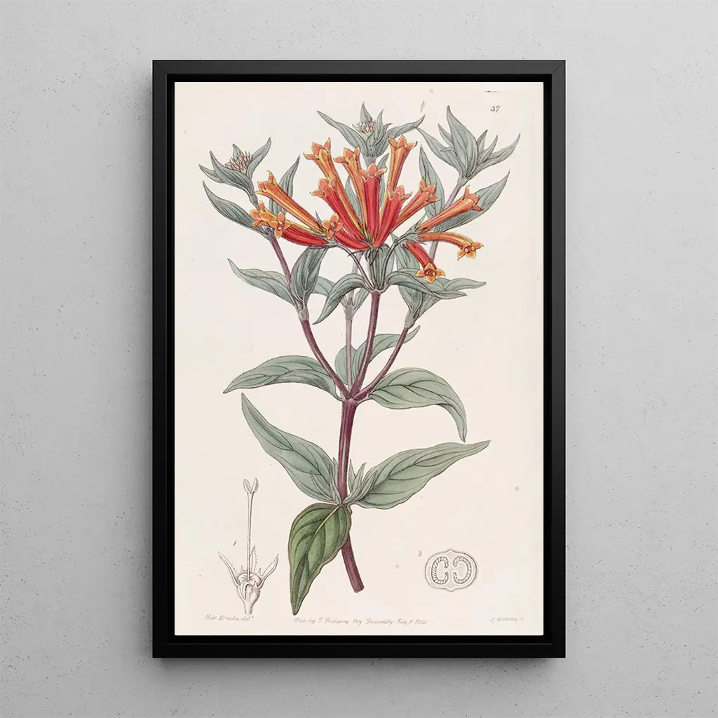 Kunsttrykket af Bouvardie écarlate af Sydenham Edwards præsenterer en strålende blomsterkomposition, hvor nuancer af rød og grøn mødes med glans. Hver blomst synes at vibrere af liv, takket være kunstnerens omhyggelige teknik, der fremhæver de delikate teksturer af kronbladene. Atmosfæren i værket er både glædesfyldt og dynamisk, hvilket inviterer betragteren til at værdsætte naturens flygtige skønhed. Dette lærred fremkalder en følelse af varme og passion, hvilket gør dette kunsttryk til en ægte visuel perle for enhver blomsterkunstentusiast.