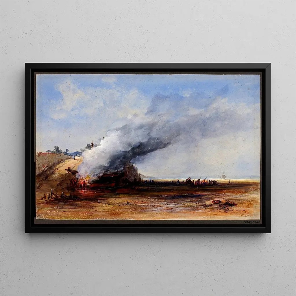 Francis Danby, aktiv i begyndelsen af det 19. århundrede, er ofte forbundet med den britiske romantiske bevægelse. Påvirket af kunstnere som J.M.W. Turner udforsker han temaer som natur og menneskelige følelser gennem sine værker. Danby formåede at fange den sublime skønhed i landskaber, samtidig med at han integrerede dramatiske elementer, som i "Incendie d'un vieux bateau". Hans karriere var præget af en søgen efter ægthed og personlig udtryk, hvilket har gjort ham bemærkelsesværdig i en kunstnerisk kontekst under forandring. Hans arv består, hvilket vidner om vigtigheden af lys og farve i romantisk kunst.