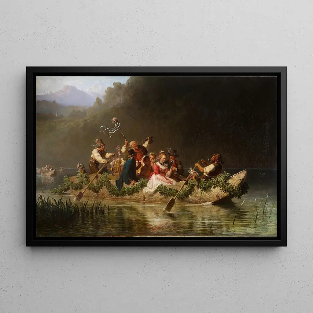 Cortège de mariage sur un lac de montagne bavarois : en kunsttryk romantisk og idyllisk scene