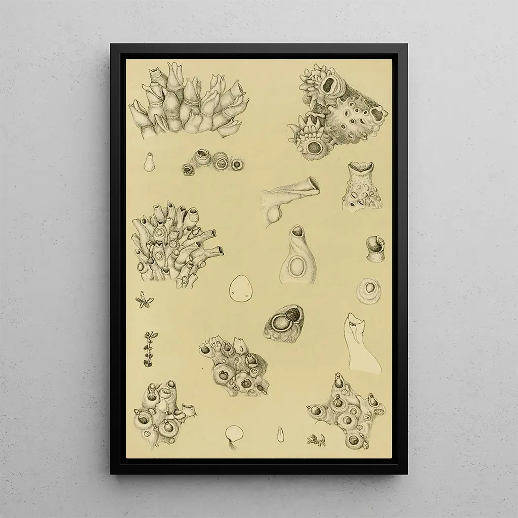 Bryozoaires I er et fascinerende kunsttryk, der afslører kompleksiteten og skønheden i bryozoarer, disse små undervandsvæsener, der ofte er ukendte. Frederick McCoy, med sit ubestridelige talent, formår at fange essensen af disse organismer gennem en rig komposition fyldt med detaljer og farver. De delikate nuancer og organiske former smelter harmonisk sammen, hvilket skaber en atmosfære, der både er fascinerende og beroligende. Dette kunsttryk inviterer til en opmærksom eftertanke, hvor hvert element fortæller en historie om livet under vandet og biodiversitetens mangfoldighed.