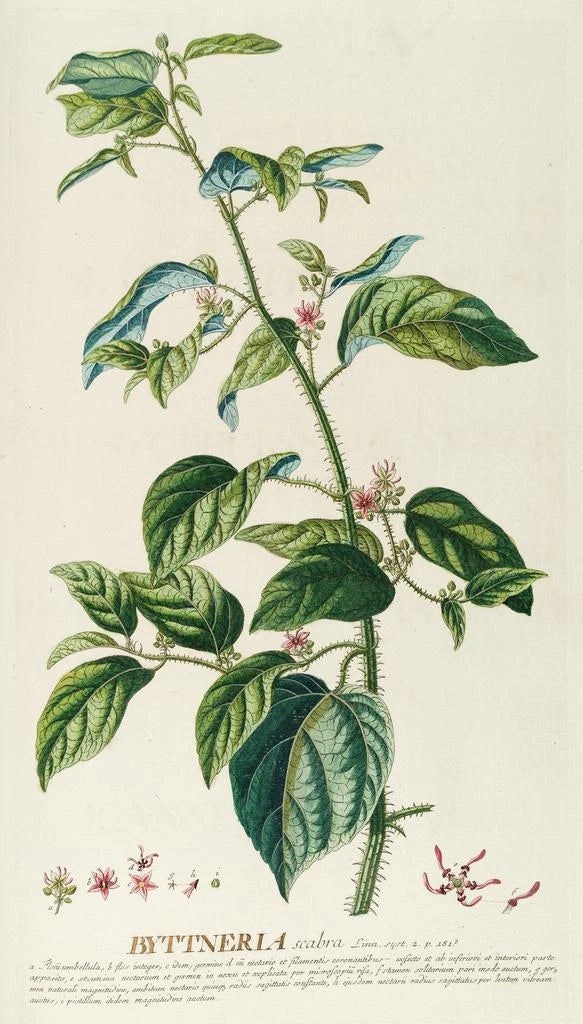 Kunsttrykket Byttneria tager os med ind i en verden af delikatesse og levende farver. Dette værk, udført med bemærkelsesværdig præcision, fremhæver de fine detaljer i blade og blomster, hvilket skaber en næsten magisk atmosfære. De livlige nuancer af grøn og rosa blander sig harmonisk, og fremkalder friskheden af en frodig have. Den graveringsteknik, kunstneren bruger, gør det muligt at fange lys og skygger, hvilket giver liv til denne fascinerende plante. Hvert element i kompositionen synes at ånde, og inviterer betragteren til at dykke ned i naturens skønhed.
