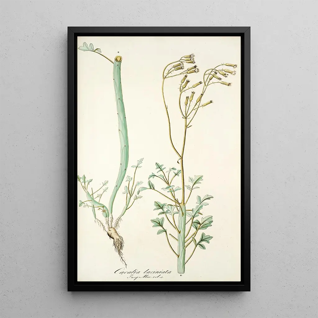 Cacalia laciniata : en fejring af den vilde flora Kunsttrykket af Cacalia laciniata tager os med til en frodig have, hvor naturen udtrykker sig i al sin pragt. De livlige nuancer af grønt og orange, kombineret med delikate former, skaber en harmonisk komposition, der fanger øjet. Den omhyggelige teknik fra kunstneren afslører teksturen af blomsterbladene og bladene, hvilket giver en følelse af dybde og liv. Dette maleri er en ægte invitation til at udforske botanikens vidundere, samtidig med at det fejrer den flygtige skønhed af vilde blomster. Nikolaus Joseph Freiherr von Jacquin : kunsten til gavn for videnskaben Nikolaus Joseph Freiherr von Jacquin, en ikonisk skikkelse fra det 18. århundrede, formåede at forene kunst og videnskab gennem sine botaniske værker. Som botaniker rejste han gennem Europa og Amerika, indsamlede eksemplarer og viden, der berigede hans kunst. Cacalia laciniata er et af hans mange værker, der vidner om hans omhyggelige observationer og kærlighed til naturen. Hans arbejde har ikke kun bidraget til botanisk videnskab, men har også påvirket datidens kunstbevægelse ved at fremhæve planternes skønhed. En dekorativ tilføjelse med mange fordele Kunsttrykket af Cacalia laciniata er et dekorativt valg, der vil pryde dit opholdsrum. Uanset om det er i stuen, på kontoret eller i soveværelset, tilføjer dette lærred et strejf af friskhed og farve. Det høje trykkvalitet garanterer en bemærkelsesværdig trofasthed til detaljerne i det originale værk, mens dets visuelle appel gør det til et centralt element i din indretning. Ved at vælge dette kunsttryk vælger du at integrere et kunstværk, der fejrer naturens skønhed, samtidig med at det tilføjer en kunstnerisk note til dit hjem.