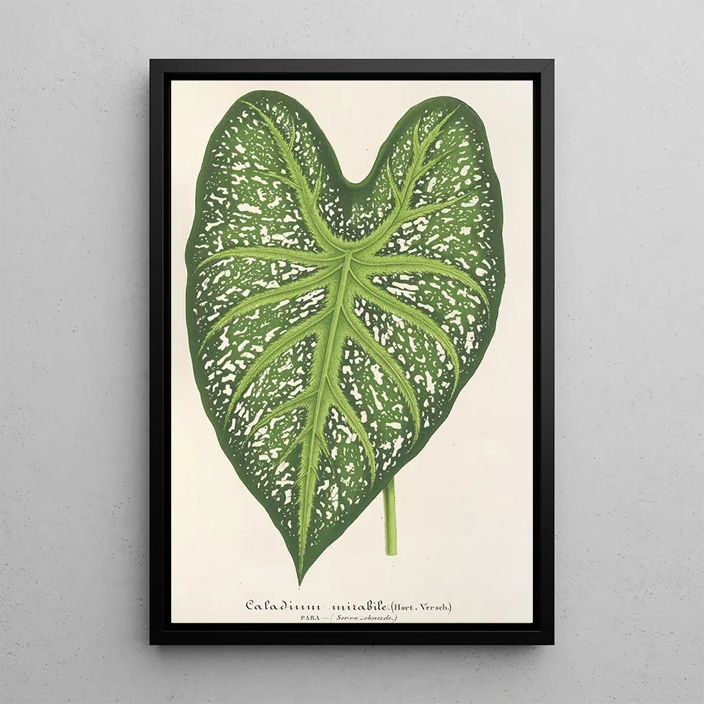 Kunsttrykket Caladium mirabile af Charles Antoine Lemaire er en sand hyldest til naturen. Bladene med deres livlige nuancer, svingende mellem skinnende grøn og delikat rosa, synes at vibrere under lyset. Kunstnerens teknik, der kombinerer akvarel og tegning, giver liv til denne tropiske plante, næsten håndgribelig. Atmosfæren, der udspringer af dette værk, er både beroligende og fortryllende, og inviterer betragteren til at dykke ned i en verden af naturlig skønhed. Hvert detalje, hver nuance, vidner om en dyb kærlighed til botanik og en enestående beherskelse af farver.