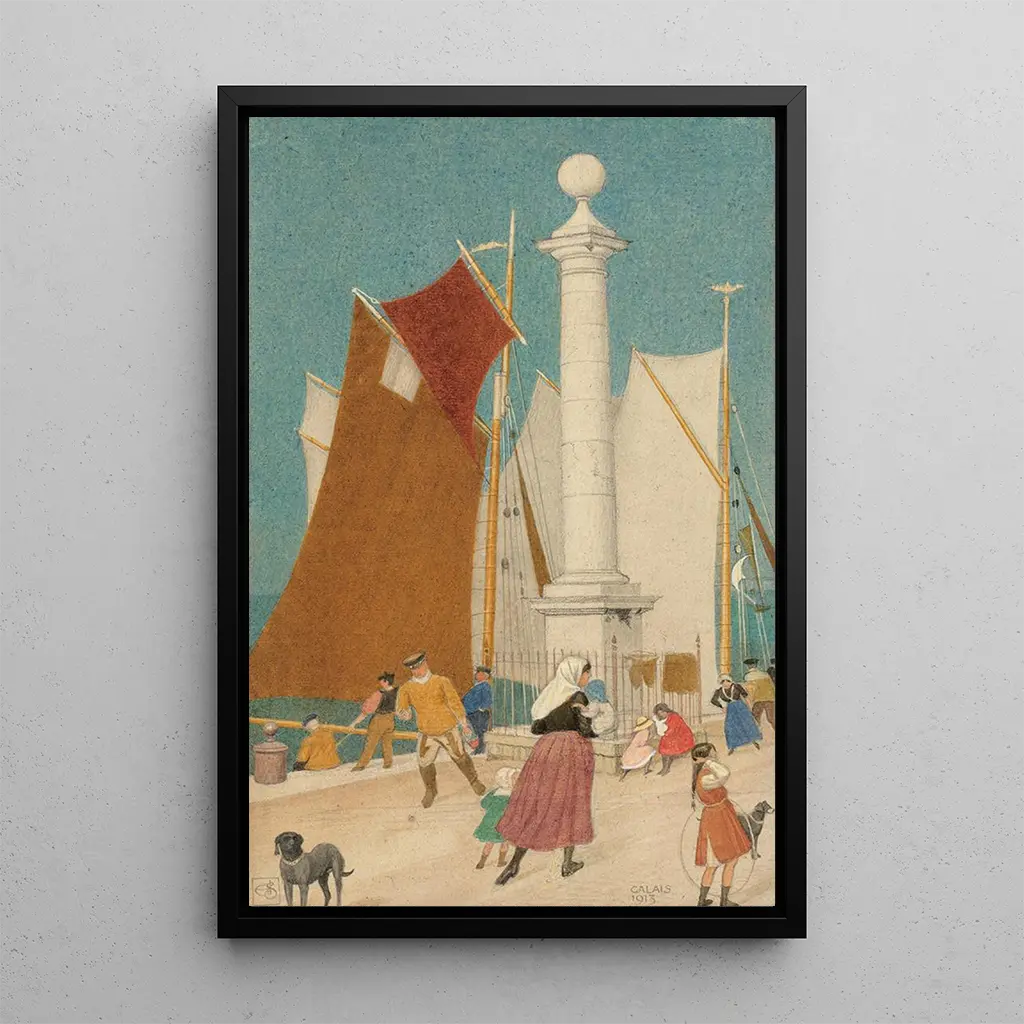 Kunsttrykket af Calais, udført af Joseph Edward Southall, fremkalder en levende og dynamisk atmosfære. Dette værk, med sine nuancer af blå og grå, fanger dagslysets refleksion på de rolige vandspejle i havnen. De hvide sejl på bådene står i kontrast til den skyerige himmel, hvilket skaber en visuel harmoni, der tiltrækker opmærksomhed. Southall bruger en oljemaleriteknik, der giver en rig tekstur til hele værket, og inviterer betragteren til at dykke ned i denne maritime scene. De omhyggelige detaljer i baggrundens bygninger tilføjer dybde til kompositionen, hvilket gør dette lærred til et ægte livsbillede.