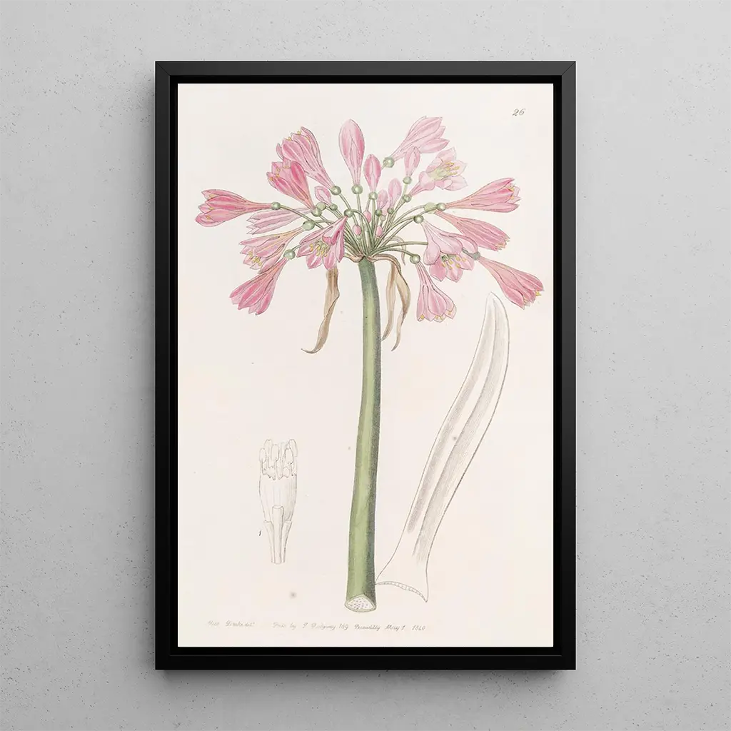 Maleri "Calostemma farvet i hudtone" af Sydenham Edwards tager os med ind i en verden, hvor naturen afslører sig med sjælden elegance. De bløde, pastelagtige nuancer i dette kunsttryk fremkalder blidhed og skrøbelighed i blomsterne. Kompositionen, omhyggeligt detaljeret, fremhæver de delikate kronblade, der næsten synes håndgribelige, mens den subtile baggrund understreger plantens skønhed. Akvarelteknikken, udført med stor mestring, giver en lethed til hele værket og skaber en beroligende og kontemplativ atmosfære. Hvert penselstrøg afslører en særlig opmærksomhed på den trofaste gengivelse af denne botaniske art.