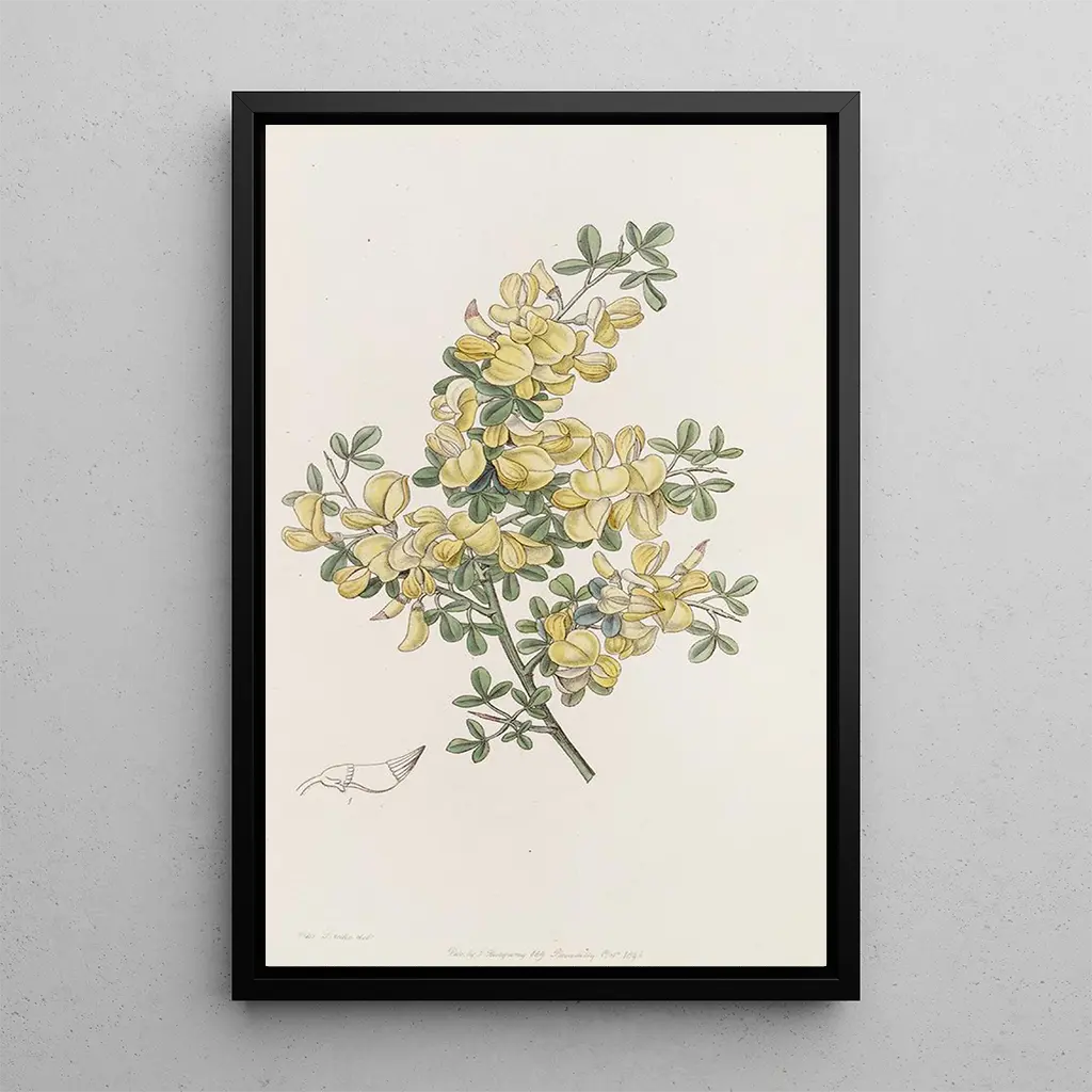 Kunsttrykket af værket "Calycotome épineux" af Sydenham Edwards tager os med til hjertet af den middelhavsflora. Med sine gyldne og grønne nuancer fremkalder dette lærred solens varme og de naturlige landskapers rigdom. Den maleteknik, Edwards anvendte, fremhæver detaljerne i blomster og blade, hvilket skaber en harmonisk og levende komposition. Hvert element i dette værk synes at fortælle en historie og inviterer betragteren til at udforske den vilde og delikate skønhed af denne ikoniske plante.