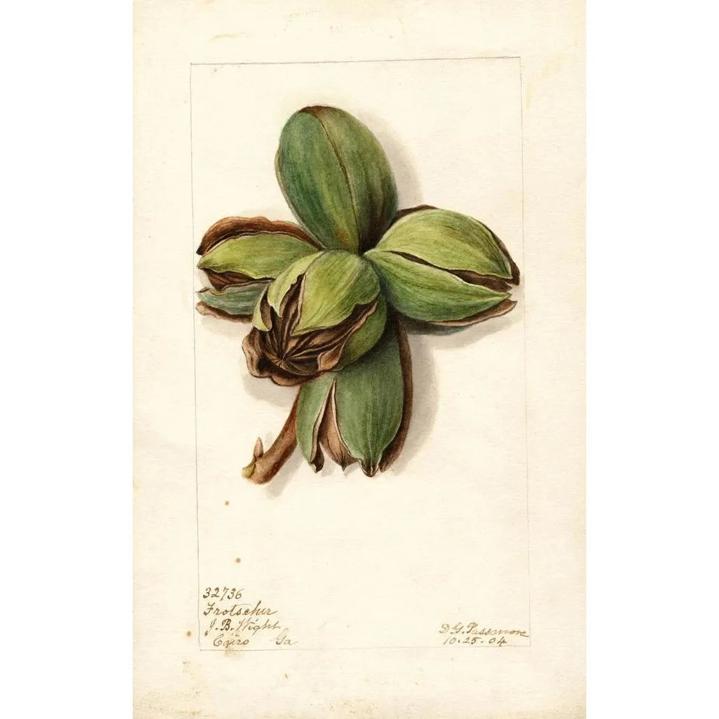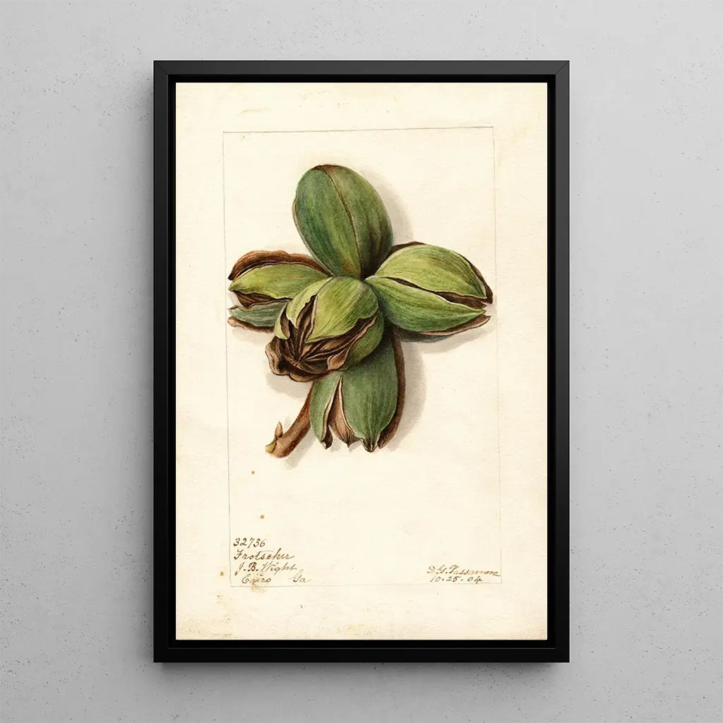 Kunsttrykket Carya Frotscher af Deborah Griscom Passmore er en fejring af den naturlige skønhed, hvor nuancer af grønt blander sig med strejf af brunt og guld. Dette værk, udført med en raffineret akvarel teknik, fremkalder majestæten af træerne og rigdommen i floraen. Hver gren, hvert blad er gengivet med en sådan ynde, at det synes at vibrere under vindens hvisken. Den overordnede atmosfære i lærredet inviterer til en fredelig refleksion, og transporterer betragteren til en frodig have fuld af liv og farver.