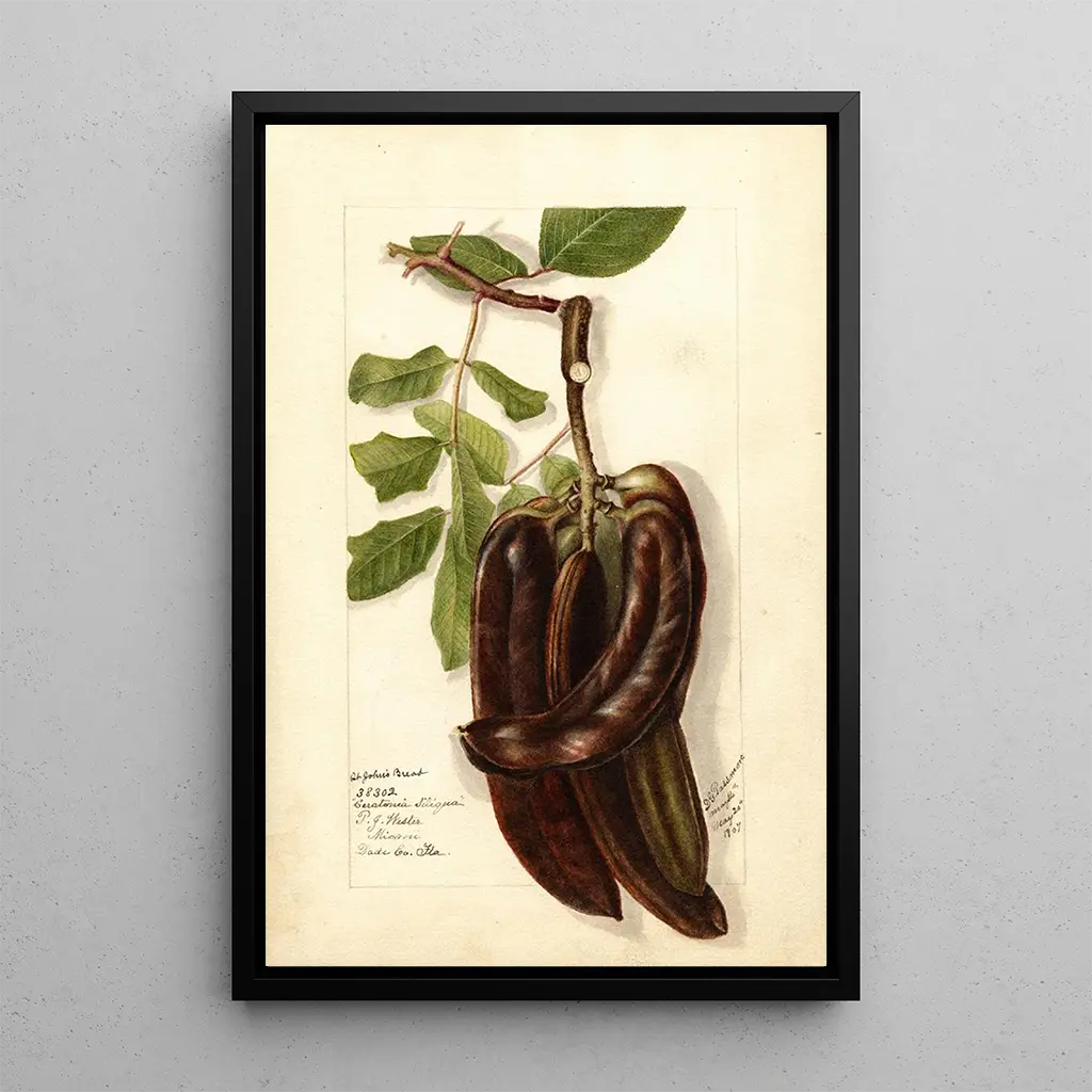 Kunsttrykket Ceratonia siliqua L af Deborah Griscom Passmore tager os med ind i en fascinerende botanisk verden. Dette værk, præget af finesse, fremhæver karobtræet, en træ med strålende grønne blade og brune bælg. De omhyggelige detaljer i kompositionen, kombineret med en palette af naturlige farver, skaber en beroligende og harmonisk atmosfære. Akvarelteknikken, anvendt med stor kunnen, fanger lyset og teksturen af bladene, hvilket giver en følelse af dybde og liv. Hvert element i dette lærred synes at invitere seeren til at forundres over den enkle, men slående skønhed i naturen.