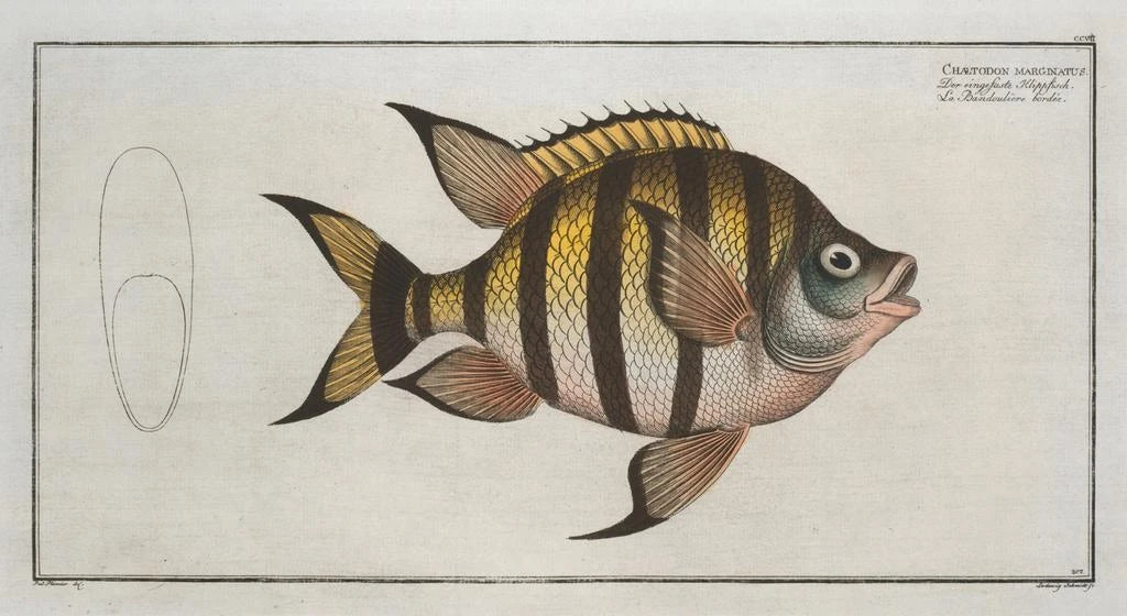 Marcus Elieser Bloch, naturalist og kunstner fra det 18. århundrede, er berømt for sine bidrag til ichthyologi, studiet af fisk. Hans værk "Ichthyologie" er en milepæl i den videnskabelige repræsentation af akvatiske arter. Bloch rejste gennem Europa og længere væk, inspireret af den marine fauna, han mødte. Hans tilgang kombinerer videnskabelig stringens med æstetik, hvilket gør ham til en pioner inden for naturalistisk kunst. Hans illustrationer, såsom den af "Chaetodon marginatus", fortsætter med at påvirke kunstnere og forskere i dag.
