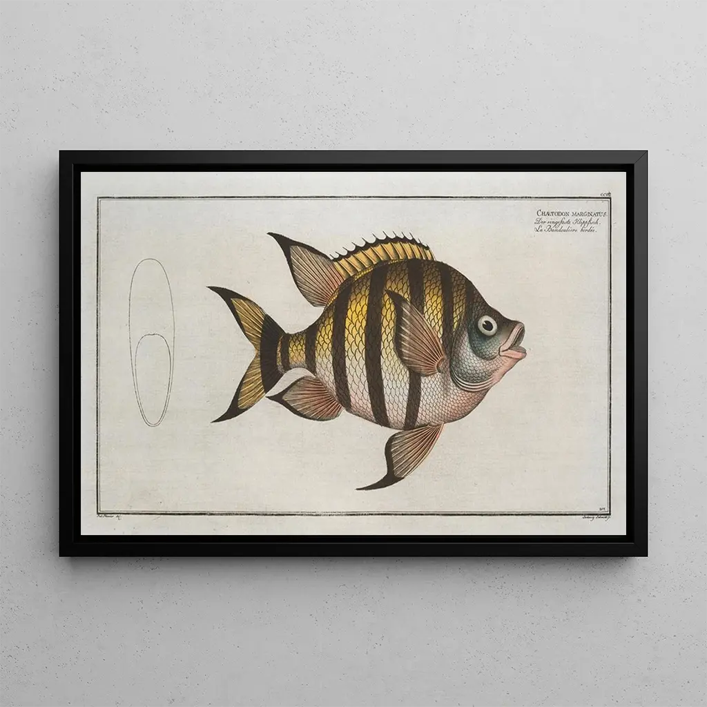 Den kunsttryk "Chaetodon marginatus" af Marcus Elieser Bloch forestiller en klovnfisk med levende farver, der illustrerer rigdommen af det marine liv. De livlige nuancer af gult, sort og blåt kombineres for at skabe et fængslende billede, hvor hver detalje er omhyggeligt gengivet. Blochs teknik, der blander videnskabelig præcision med kunstnerisk følsomhed, gør det muligt at fange elegance af dette akvatiske dyr. Dette kunstværk inviterer til at udforske dybderne af oceanerne og fejrer skønheden og mangfoldigheden af marine arter.