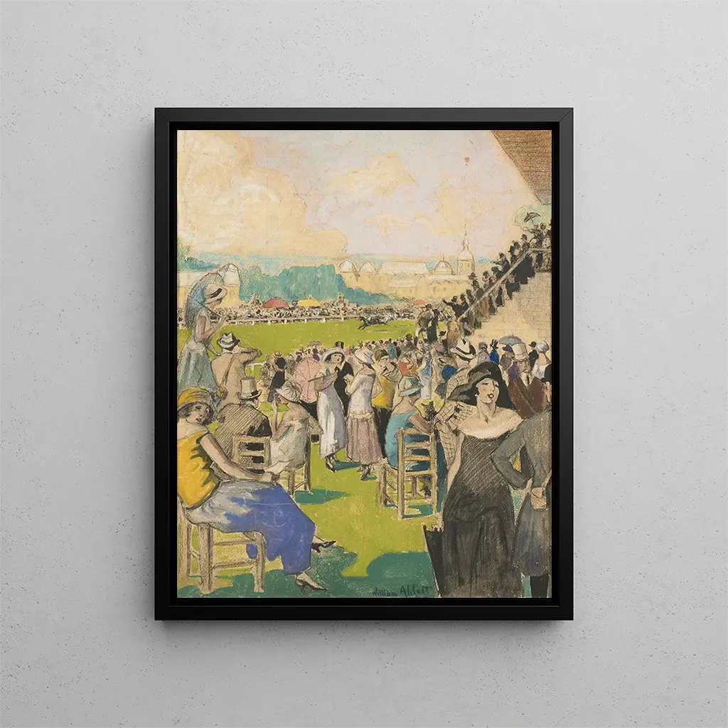 Scenen, badet i blid belysning, skildrer en eftermiddag på hippodromen: galopperende heste, elegant klædte tilskuere, og den mondæne atmosfære, der gør Chantilly berømt.