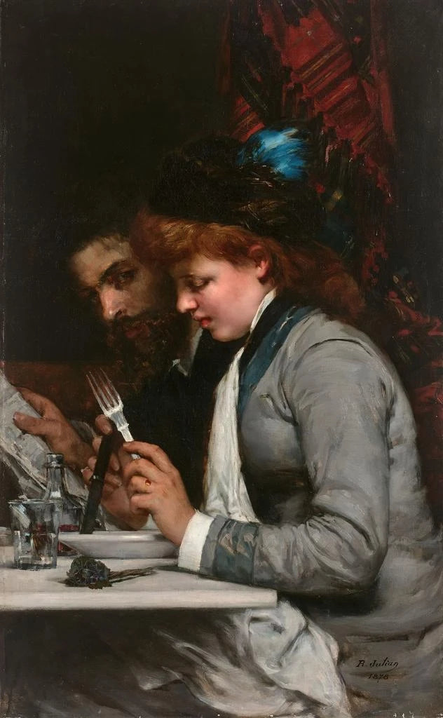 Kunsttrykket af "Hos Duval" dykker ned i intimiteten i en parisisk café, hvor karaktererne engagerer sig i livlige samtaler. Rodolphe Julian, med sin palette af varme farver og sine dynamiske penselstrøg, formår at fange essensen af det daglige liv i slutningen af det 19. århundrede. Detaljerne i ansigterne og klienternes gestus, samt den hyggelige atmosfære på stedet, skaber en levende og engagerende stemning. Dette værk, både realistisk og udtryksfuldt, inviterer os til at dele et øjeblik fanget i tiden, hvor hvert blik og hvert smil fortæller en historie.