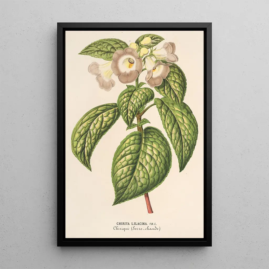 Kunsttrykket af Chirita lilacina tager os med ind i en verden af blidhed og finesse. Dette værk fremhæver de delikate nuancer i blomsten, med subtile lilla nuancer, der blander sig med hvide og grønne strejf. Den akvarelteknik, som Lemaire bruger, giver liv til hver detalje og hylder den flygtige skønhed af denne plante. Atmosfæren, der udspringer af dette lærred, er fyldt med poesi og inviterer betragteren til at forundres over naturens enkelhed og elegance.