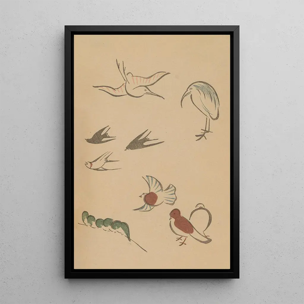 Kunsttrykket Choju ryakugashiki Pl23 af Masayoshi Kitao tager os med til en fortryllende verden, hvor dyreliv og flora blomstrer i en visuel symfoni. De delikate nuancer af blå og grøn, kombineret med indslag af livlige farver, skaber en levende og glædesfyldt atmosfære. Teknikken med ukiyo-e, med sine præcise streger og udsøgte mønstre, fanger naturens flygtige skønhed. Hvert eneste detalje, fra fuglenes fjer til blomsterbladenes kronblade, er gengivet med en sådan finesse, at det næsten synes at komme til live. Dette værk inviterer til en fuldstændig fordybelse i en poetisk og naturlig verden.