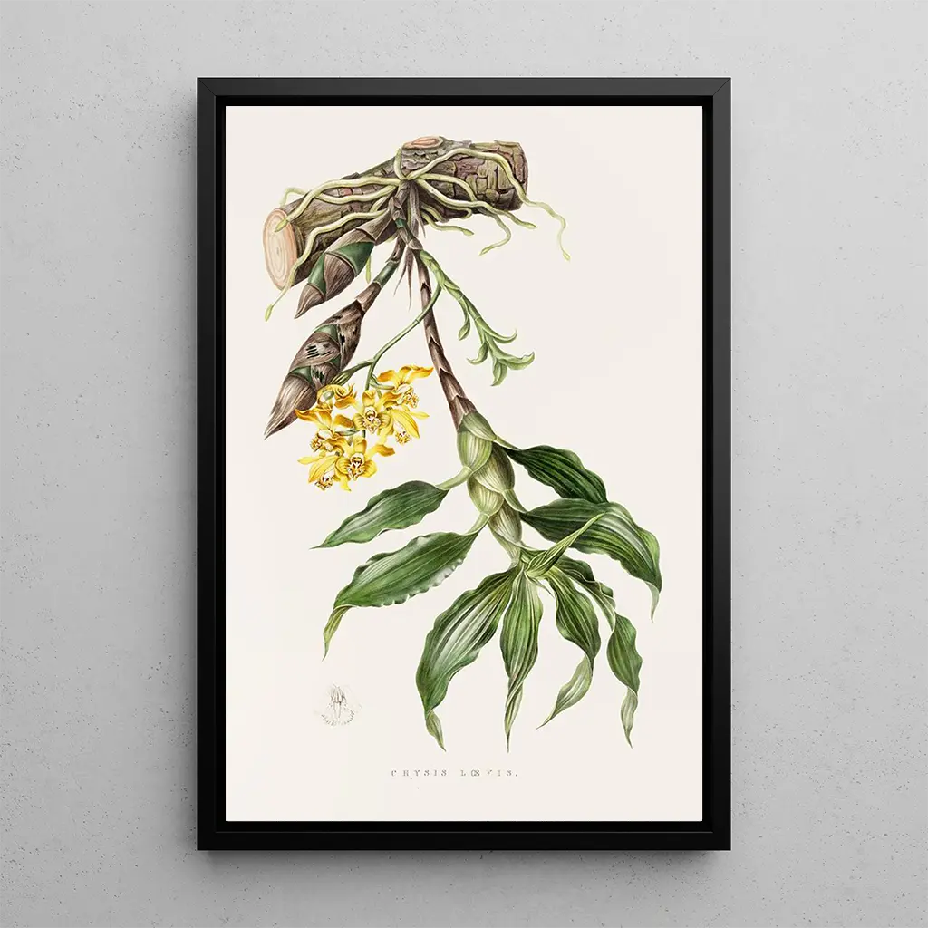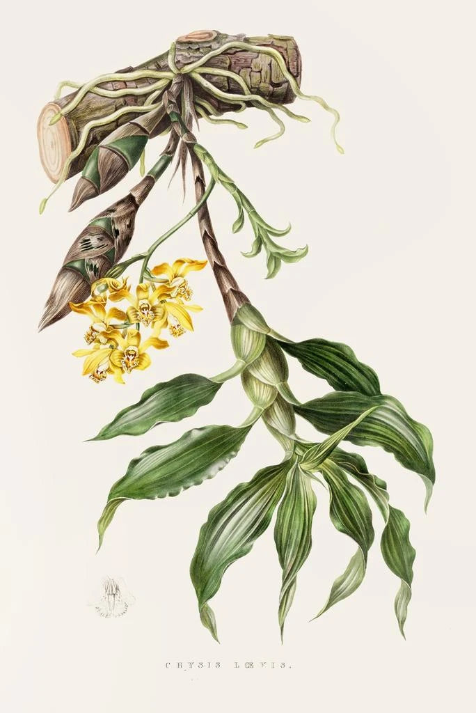Kunsttrykket af Chysis Loevis inviterer os til at opdage en orkidé med delikate former og strålende farver. Med sine blomsterblade i en skinnende gul nuance og nuancer af rød tiltrækker dette værk straks opmærksomhed. Akvarelteknikken, mestret af James Bateman, formår at gengive gennemsigtigheden og letheden i blomsterne, hvilket skaber en næsten drømmeagtig atmosfære. Hvert detalje er omhyggeligt arbejdet, hvilket giver en realistisk og poetisk fremstilling af denne fascinerende plante. Dette maleri er en sand hyldest til den naturlige skønhed og fanger essensen af den tropiske flora.