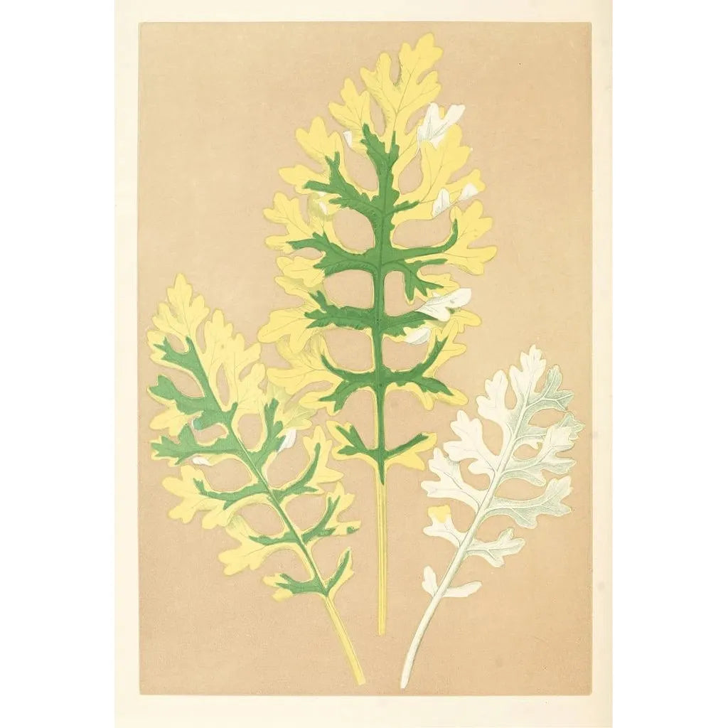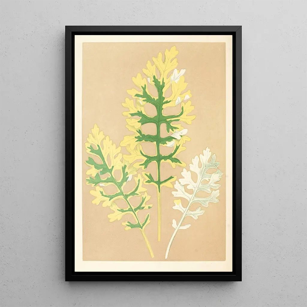 Kunsttrykket af Cineraria Maritima Fairbairnianum, udført af Edward Joseph Lowe, afslører en strålende og lysende skønhed. Nuancerne af sølvgråt og blødt grønt flettes harmonisk sammen, hvilket skaber en visuelt fængslende komposition. Kunstnerens teknik, der kombinerer præcision og finesse, gør det muligt at mærke teksturen af bladene og letheden af blomsterne. Dette værk, fyldt med poesi, fremkalder en hemmelig have, hvor hver detalje er omhyggeligt observeret og fremhævet. Lærredet inviterer til en sanseflugt, hvor naturen udtrykker sig i al sin pragt.