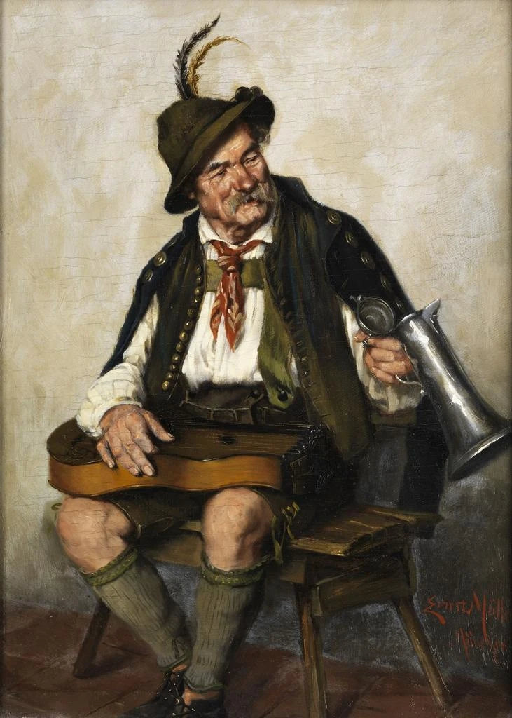 Maleri af spiller med citar og ølkrus - Ernst Müller | Kunsttryk
