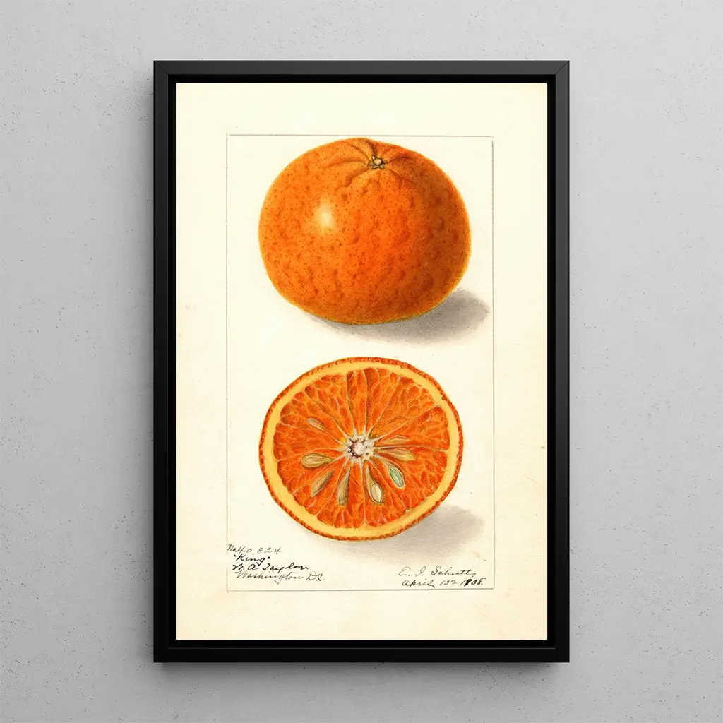 Ellen Isham Schutt, kunstner fra begyndelsen af det 20. århundrede, specialiserede sig i botanisk kunst, et område der kombinerer videnskabelig præcision med æstetik. Påvirket af naturalistbevægelsen formåede hun at fange skønheden i planter og frugter med en bemærkelsesværdig finesse. Hendes værker, herunder kunsttrykket af Citrus nobilis King, vidner om en tid, hvor kunst og videnskab gik hånd i hånd for at fejre naturen. Schutt bidrog til at popularisere botanisk kunst som en kunstnerisk udtryksform, hvilket efterlader en varig arv i kunstverdenen.