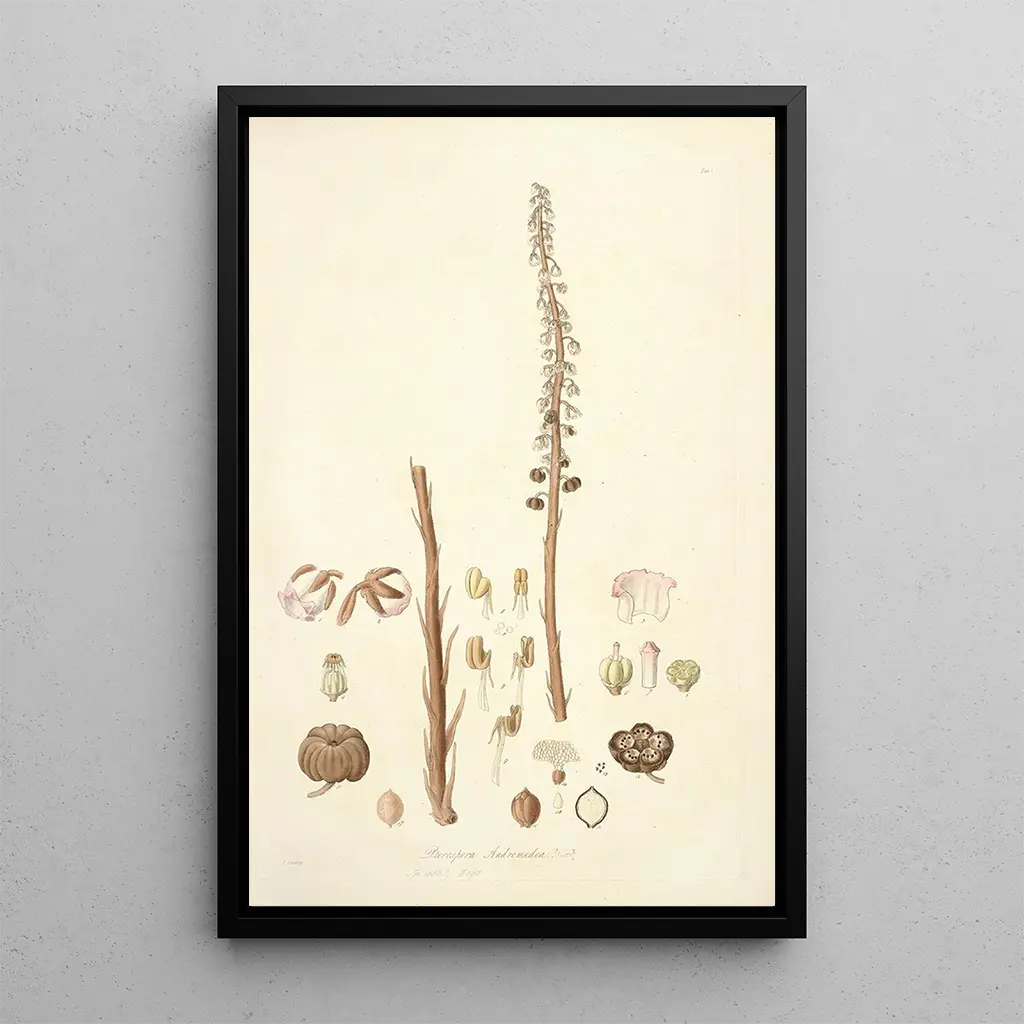 Kunsttrykket af værket "Collectanea botanica Pl05" tager os med ind i en verden, hvor naturen blomstrer under John Lindleys penselstrøg. Dette lærred skiller sig ud med sin palette af livlige og harmoniske farver, hvor de strålende grønne toner møder strejf af gult og rosa, hvilket fremhæver floraens rigdom. Kompositionen, omhyggeligt sammensat, fremviser botaniske eksempler med videnskabelig præcision, samtidig med at den bibeholder en vis visuel poesi. Atmosfæren, der udspringer af dette værk, inviterer til forundring og eftertanke, og fejrer skønheden og kompleksiteten i den plantebaserede verden.