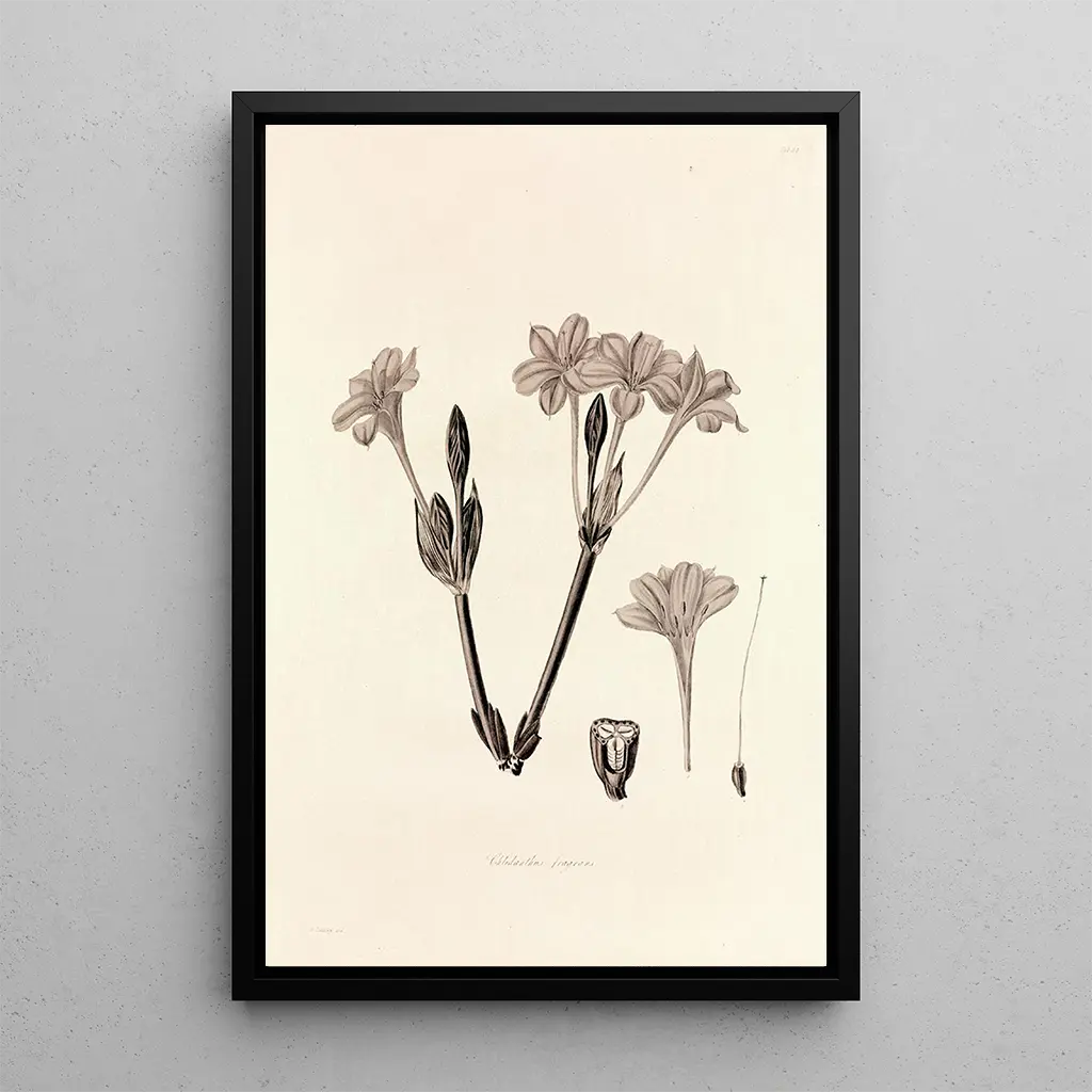 Kunsttrykket af værket "Collectanea botanica Pl34" af John Lindley tager os med på en rejse ind i en verden, hvor hver plante er et kunstværk i sig selv. De fine detaljer i blomster og blade er gengivet med bemærkelsesværdig præcision, hvilket afslører naturens iboende skønhed. Farverne, fra pastelfarver til mere livlige nuancer, skaber en beroligende og inspirerende atmosfære. Lindley formår gennem sit talent at fange harmoni og mangfoldighed i plantens rige, og inviterer betragteren til at værdsætte formernes og farvernes pragt. Dette lærred er en ægte invitation til at opdage botanikkens vidundere.