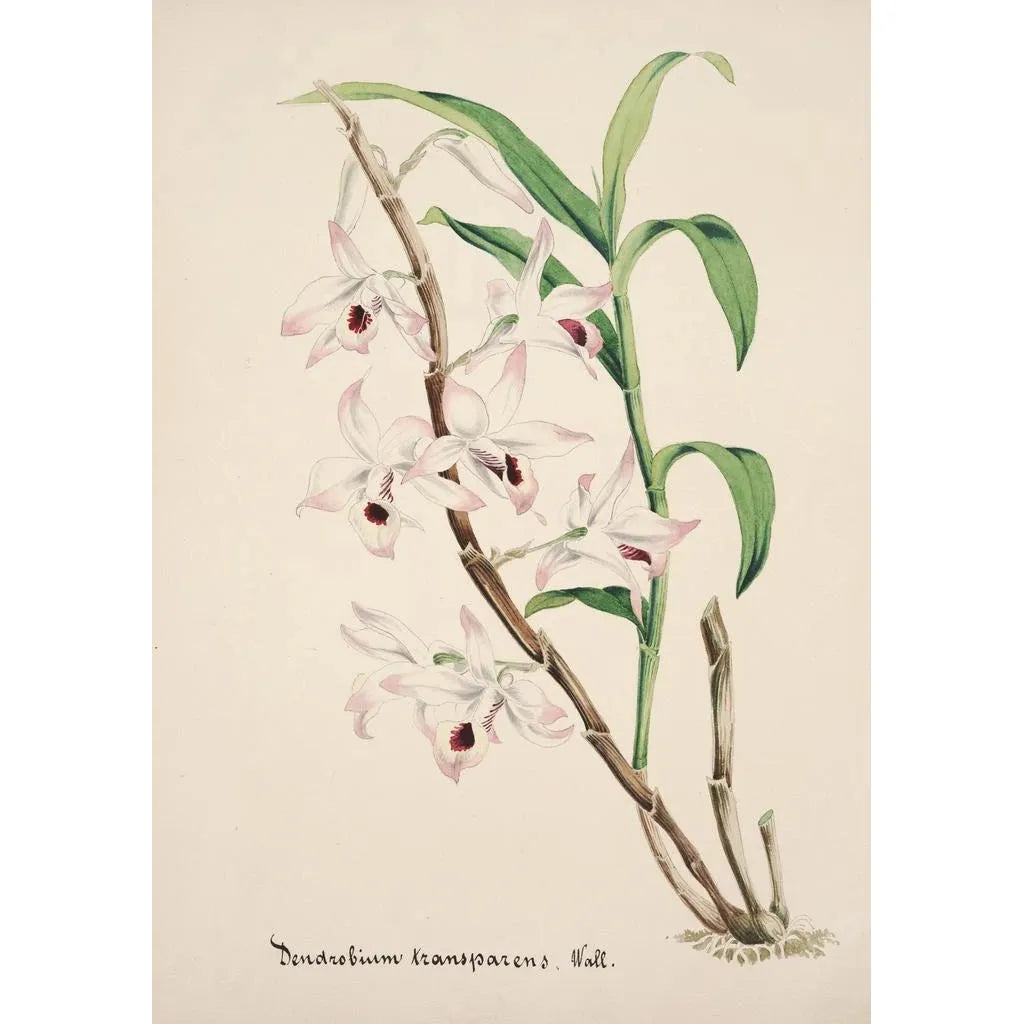 Dette anonyme værk, der sandsynligvis stammer fra det 19. århundrede, er en del af en tradition, hvor blomsterkunst var både en æstetisk udtryksform og en botanisk studie. Kunstnerne fra denne periode, påvirket af den romantiske bevægelse, søgte at udjævne skønheden af blomster, ofte set som symboler på passion og ynde. Selvom kunstnerens identitet forbliver ukendt, vidner hans finhed i arbejdet om en dyb forståelse af former og farver, karakteristisk for blomsterkunstnere fra sin tid. Især orkidéerne var eftertragtede for deres sjældenhed og elegance, hvilket gjorde dem til et foretrukket motiv.