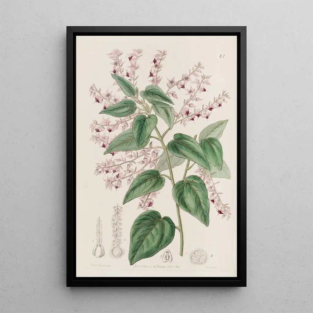 Kunsttrykket Corethrostylis aux bras roses af Sydenham Edwards præsenterer en fascinerende komposition, hvor de livlige rosa nuancer blander sig med strålende grønne nuancer. Hvert element i dette værk er omhyggeligt detaljeret, hvilket afslører kompleksiteten og skønheden i denne unikke plante. Brugen af akvarel skaber en let og luftig atmosfære, der inviterer betragteren til at dykke ned i den delikate botaniske verden. Dette maleri er en sand hyldest til naturen, der fejrer mangfoldigheden og pragtet af blomsterarter.