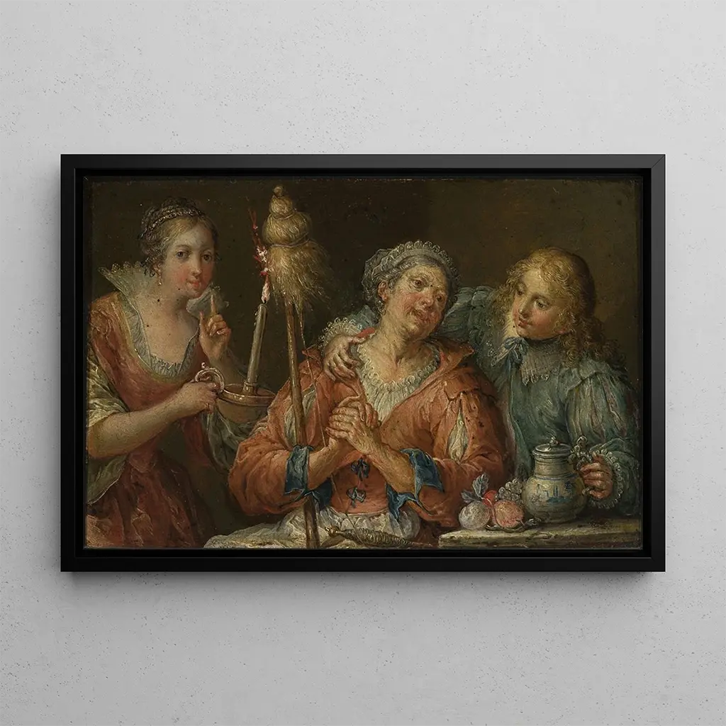 I denne kunsttryk af værket "Cour" dykker Johann Georg Platzer ned i en verden af ro. Kompositionen, delikat afbalanceret, fremhæver figurer i fuld interaktion, omgivet af en frodig natur. De bløde og varme farver, fra beroligende grønne til jordnære nuancer, skaber en fredelig atmosfære. Kunstnerens teknik, der klogt blander lys og skygge, giver liv til hver detalje og inviterer betragteren til at dykke ned i denne idylliske scene. Hvert element, fra bladgrønne til figurers kostumer, synes at fortælle en historie, en invitation til fordybelse.