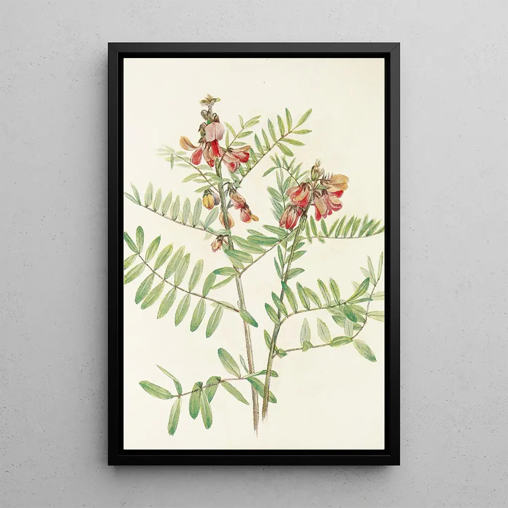 Kunsttrykket af Cracca de Virginie tager os med ind i en blomsterverden, hvor delikatesse af blomsterbladene blander sig med de livlige nuancer. Dette værk af Mary Vaux Walcott, med sine nuancer af lilla, grøn og hvid, fremkalder den flygtige skønhed af vilde blomster. Akvarelteknikken, brugt med mesterlighed, gør det muligt at fange lyset og gennemsigtigheden i de naturlige elementer, hvilket skaber en atmosfære, der både er rolig og vibrerende. Hvert detalje, fra bladnervene til de fine skygger, vidner om en grundig observation og en passion for naturen.