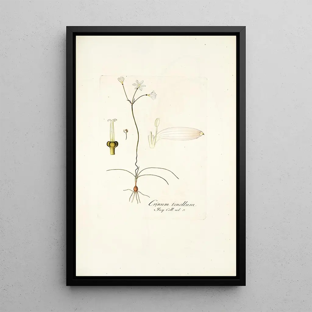 Crinum tenellum : en delikat blomsterharmoni Ladet af Nikolaus Joseph Freiherr von Jacquin afslører en subtil og raffineret skønhed. Pastelfarverne flettes blidt sammen og skaber en beroligende og kontemplativ atmosfære. Akvarelteknikken, mestret af kunstneren, gør det muligt at fange letheden af blomsterbladene, samtidig med at de fine nuancer af lyset fremhæves. Hvert detalje er omhyggeligt gengivet, hvilket inviterer betragteren til at dykke ned i dette blomsterunivers. Kompositionen, balanceret og harmonisk, giver en følelse af ro, som om man befinder sig i hjertet af en hemmelig have. Nikolaus Joseph Freiherr von Jacquin : en pioner inden for kunstnerisk botanik Nikolaus Joseph Freiherr von Jacquin, botaniker og kunstner fra det 18. århundrede, spillede en afgørende rolle i udviklingen af botanisk illustration. Uddannet ved Wiens Universitet, blev han påvirket af datidens videnskabelige opdagelser og rejste til kolonier for at studere den eksotiske flora. Hans værker, herunder Crinum tenellum, vidner om hans engagement i at forene videnskab og kunst. Som medlem af Royal Society i London bidrog Jacquin til spredningen af botanisk viden, hvilket gør ham til en uundværlig figur i kunst- og naturvidenskabens historie. En dekorativ kunsttryk med mange fordele Kunsttrykket af Crinum tenellum er et ideelt valg til at forskønne dit hjem, uanset om det er i stuen, på kontoret eller i soveværelset. Dets trofaste trykkvalitet og æstetiske appel gør det til et dekorativt stykke, der vil fange opmærksomheden. Ved at integrere dette kunsttryk i din indretning tilføjer du et strejf af natur og ro til dit rum. Blomsterens delikatesse og farvernes blidhed skaber en varm og indbydende atmosfære, samtidig med at det tilføjer et strejf af elegance til din indretning.