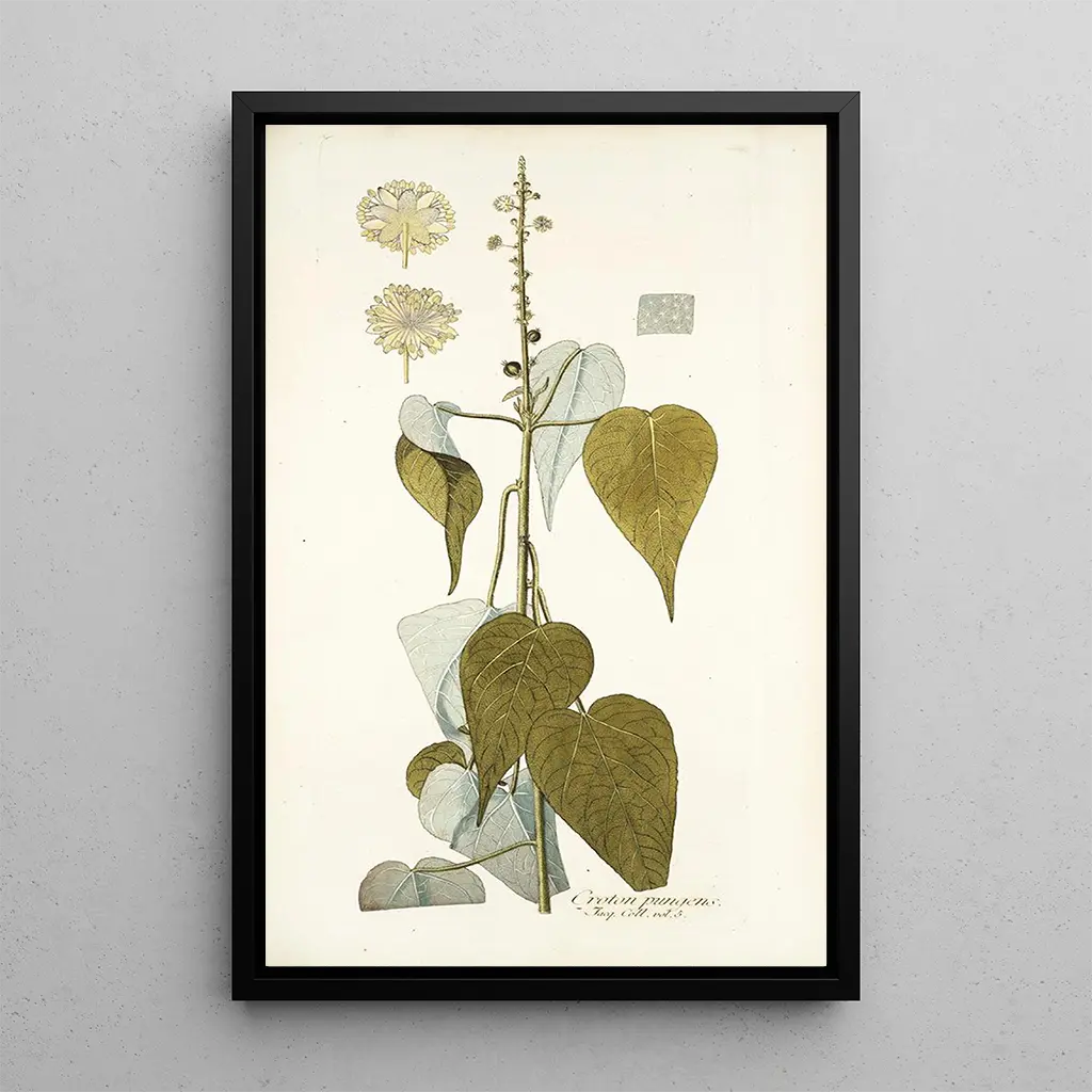 Croton pungens : en hyldest til den tropiske natur Kunsttrykket af Croton pungens afslører en fascinerende botanisk komposition, hvor nuancer af skinnende grønt blander sig med strejf af gult og orange. Akvarelteknikken, anvendt af Nikolaus Joseph Freiherr von Jacquin, gør det muligt at fange bladenes og stænglernes finhed og skaber en levende og dynamisk atmosfære. Hvert detalje, fra årenes struktur til teksturen af stænglerne, er gengivet med en præcision, der inviterer til grundig observation. Dette værk, både videnskabeligt og kunstnerisk, transporterer os til en frodig verden, hvor skønheden af den tropiske flora fremhæves. Nikolaus Joseph Freiherr von Jacquin : en pioner inden for kunstnerisk botanik Nikolaus Joseph Freiherr von Jacquin, botaniker og kunstner fra det 18. århundrede, spillede en væsentlig rolle i studiet af eksotiske planter. Uddannet i Wien, blev han påvirket af opdagelsesrejserne i sin tid, især i Sydamerika og Caribien. Hans værker, som Croton pungens, vidner om hans engagement i at dokumentere biodiversitet, samtidig med at de udviser en kunstnerisk følsomhed. Jacquin bidrog til viden om tropiske planter i Europa, og hans illustrationer er blevet referencepunkter inden for botanik. Hans arv består, og inspirerer fremtidige generationer af kunstnere og forskere. En dekorativ tilføjelse med mange fordele Kunsttrykket af Croton pungens er et ideelt dekorativt stykke til at berige dit hjem, uanset om det er i stuen, på kontoret eller i soveværelset. Dets trykkvalitet og trofasthed mod det originale værk sikrer en uomtvistelig æstetisk appel. Dette lærred fremkalder skønheden i naturen, samtidig med at det tilføjer et strejf af eksotisme til din indretning. Ved at vælge dette lærred vælger du et værk, der ikke blot forskønner dit rum, men også fortæller en fascinerende historie om botanik og kunst. Lad dig forføre af dette kunsttryk, en ægte invitation til fordybelse.