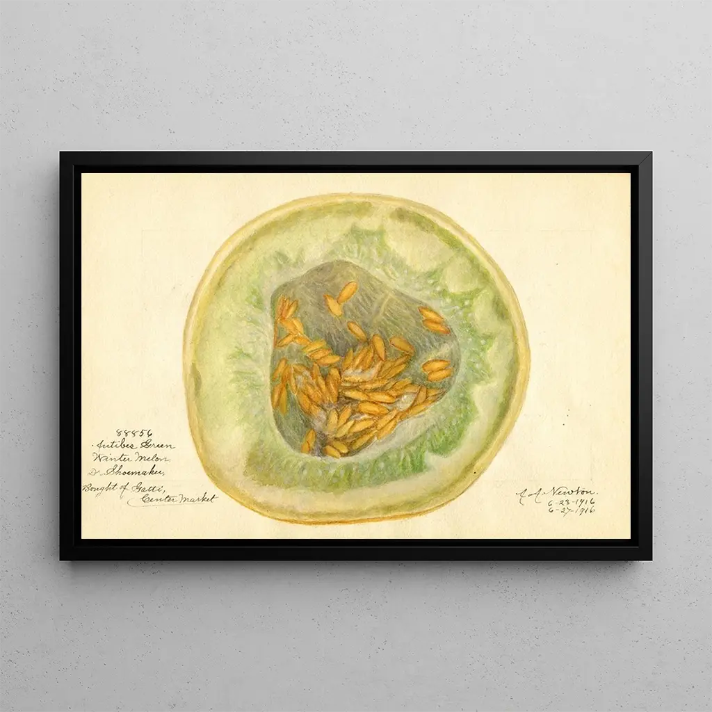 Den kunsttryk "Cucumis melo Antibes Green" af Amanda Almira Newton fejrer skønheden i frugt med en bemærkelsesværdig finesse. Dette livlige maleri fremhæver en moden melon, hvis nuancer af grøn og gul fremkalder friskhed og vitalitet. Newtons teknik, kendetegnet ved detaljerede finurligheder og subtil belysning, giver liv til dette frugt, næsten håndgribeligt. Atmosfæren i værket er både glædesfyldt og beroligende, hvilket inviterer betragteren til at værdsætte enkelheden og naturens skønhed.