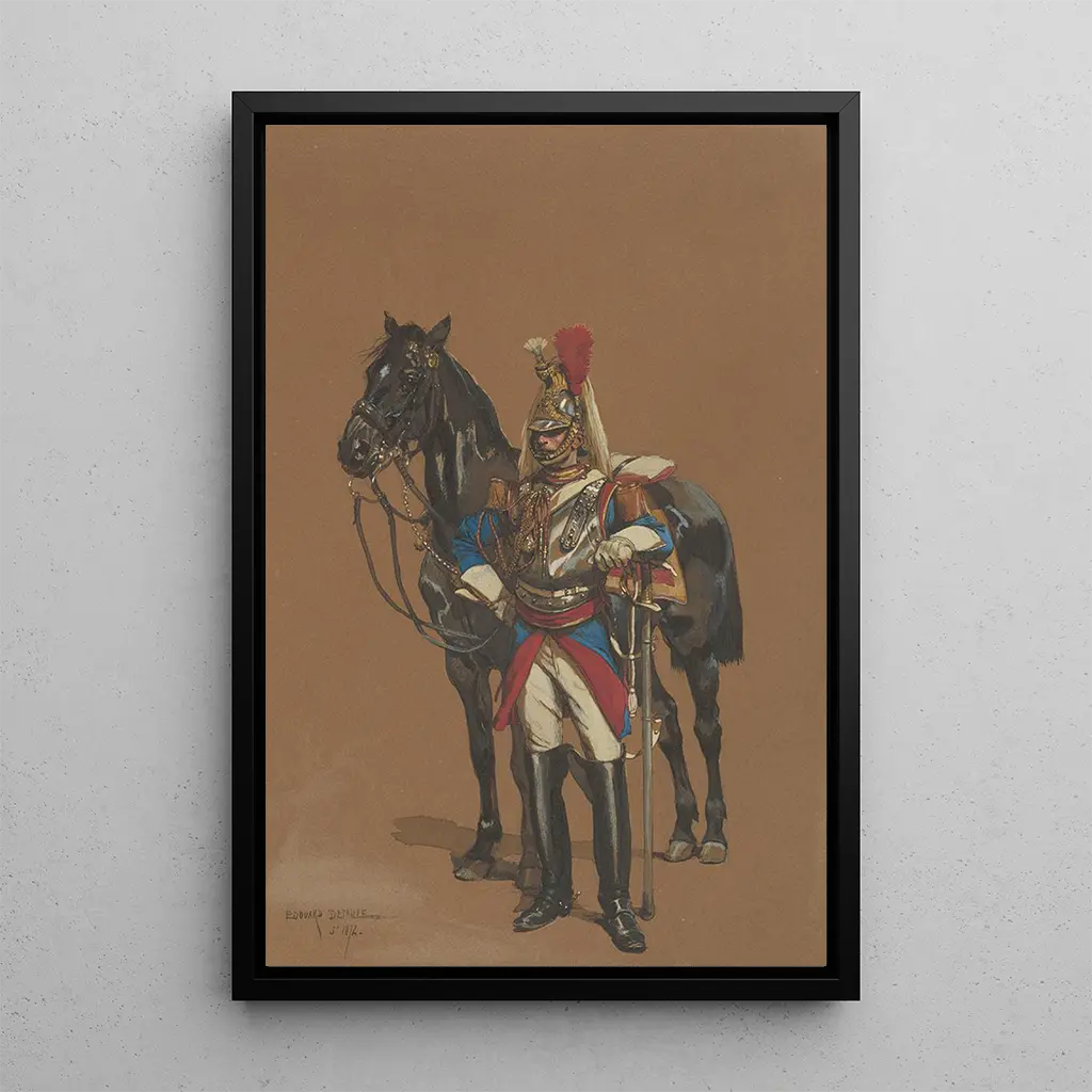 I "Cuirassier" giver Jean-Baptiste Édouard Detaille os et slående portræt af en rytteri i rustning, symbol på mod og militær ære. Lærredet skiller sig ud med sin rige farvepalette og sin dynamiske komposition, hvor cuirassieren ser ud til at være klar til at springe ud i handling. De omhyggelige detaljer i rustningen og hesten vidner om kunstnerens enestående talent for at fange den militære livs realitet. Atmosfæren er både majestætisk og imponerende, hvilket vækker en følelse af stolthed og beslutsomhed, og inviterer betragteren til at beundre denne guerriers adel.