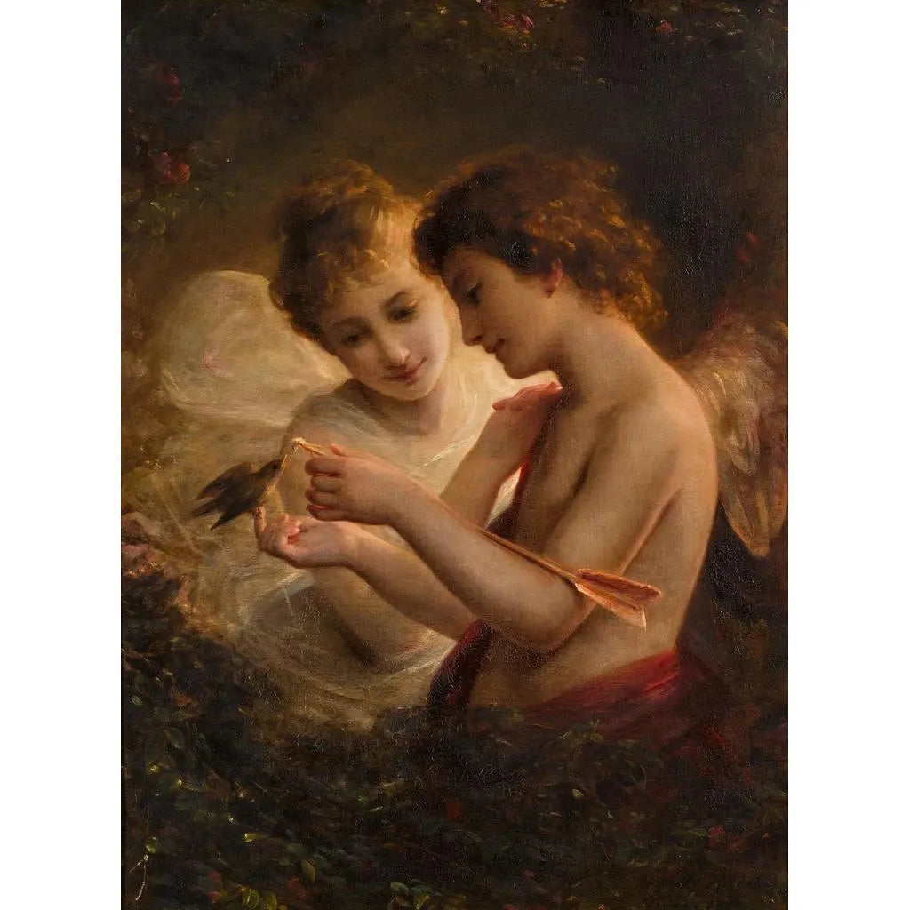 I kunsttrykket af "Cupidon og Psyche" fanger August Riedel en mytologisk scene præget af blidhed og passion. De bløde farver og de delikate nuancer i lærredet fremkalder en drømmende atmosfære, hvor figurerne af Cupidon og Psyche mødes i en omfavnelse fuld af løfter. Riedels teknik, der dygtigt blander chiaroscuro og minutøse detaljer, giver liv til dette guddommelige møde og skaber en visuel dialog mellem figurerne. Hvert penselstrøg synes at fortælle en historie og inviterer betragteren til at dykke ned i dette øjebliks intimitet.