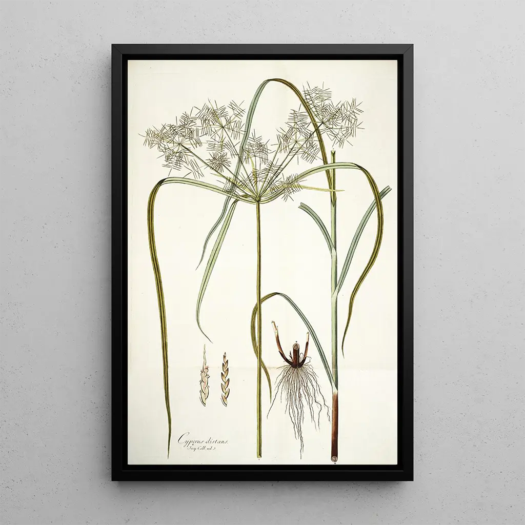 Valget af dette kunsttryk af Cyperus distans betyder, at du vælger et dekorativt stykke, der vil berige dit opholdsrum. Uanset om det er i stuen, på kontoret eller i soveværelset, tilføjer dette billede et strejf af elegance og ro. Dets trykkvalitet og trofasthed mod de naturlige farver gør det til et ideelt valg for dem, der værdsætter harmoni mellem kunst og natur. Ved at integrere dette værk i din indretning skaber du et inspirerende miljø, der fejrer plantens skønhed og botanisk kunst.