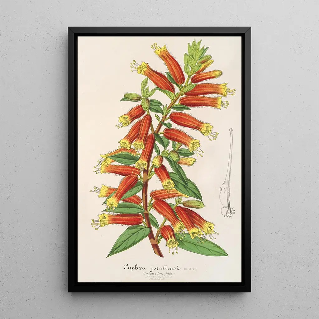 Dette kunsttryk af Cypha Cuphea jorullensis er et perfekt dekorativt valg til at tilføre et strejf af eksotisme til dit hjem. Uanset om det er i stuen, på kontoret eller i soveværelset, vil det kunne fange opmærksomheden og lyse op i rummet. Kvaliteten af trykket og farvernes trofasthed gør dette lærred til en ægte æstetisk fordel. Ved at integrere dette værk i din indretning vælger du at tilføje en friskhed og dynamik, samtidig med at du hylder naturens skønhed gennem kunsten.