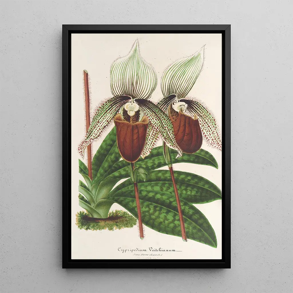Kunsttrykket af Cypripedium Veitchianum er et ideelt dekorativt stykke til at forskønne forskellige rum, uanset om det er i en stue, et kontor eller et soveværelse. Det høje trykkvalitet sikrer en bemærkelsesværdig trofasthed over for farver og detaljer i det originale værk, hvilket giver en æstetisk tiltrækning, der ikke kan benægtes. Ved at integrere dette lærred i din indretning tilføjer du et strejf af natur og elegance til dit hjem. Dette kunsttryk, med sin blomsterlige charme, vil tiltale kunst- og botanikkendere, samtidig med at det skaber en beroligende og inspirerende atmosfære.